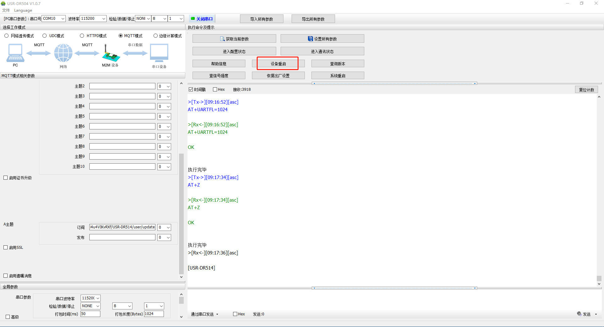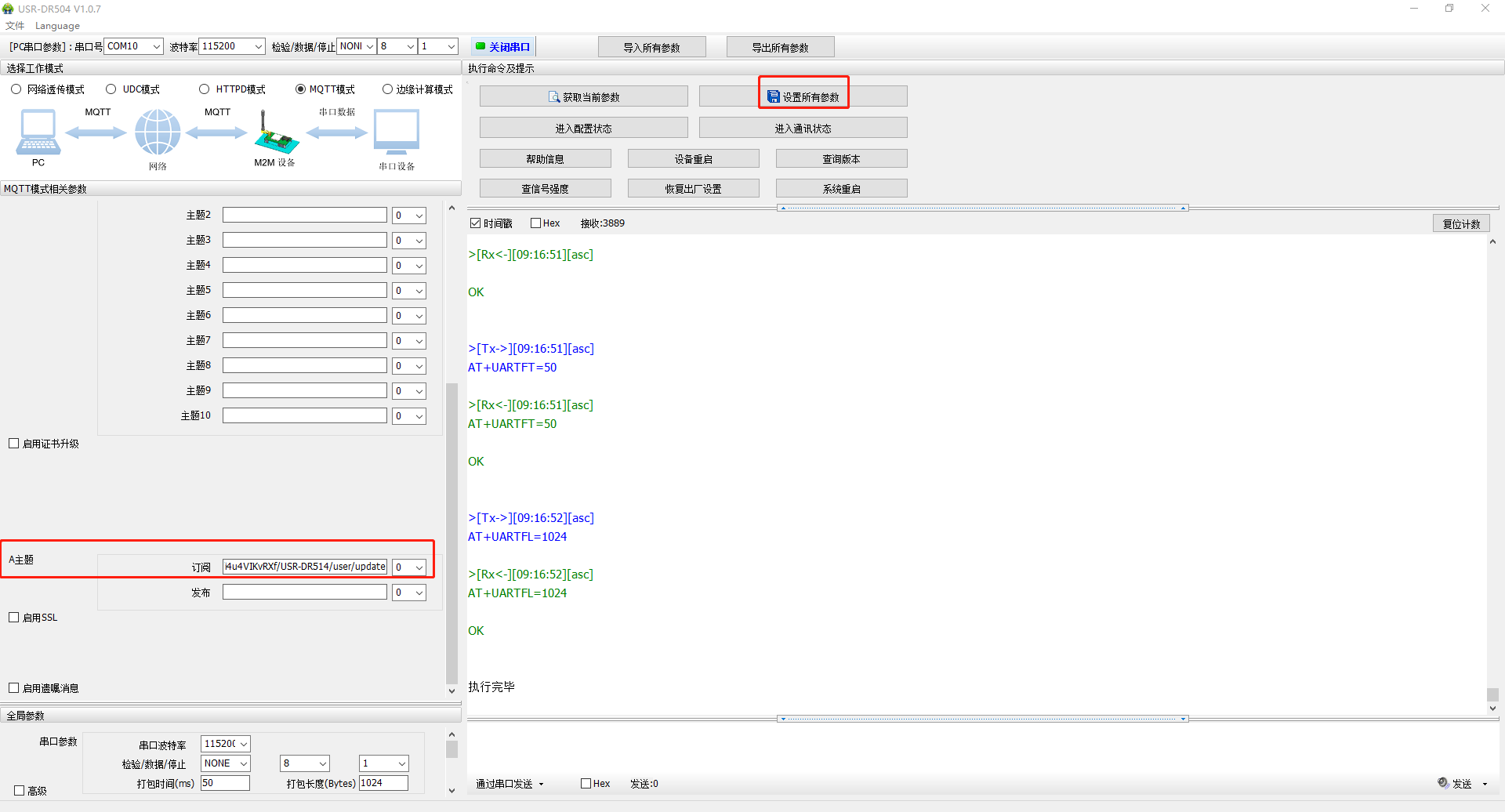 發(fā)布主題:/i4u4VIKvRXf/USR-DR514/user/update,設(shè)置軟件點(diǎn)擊設(shè)置所有參數(shù)