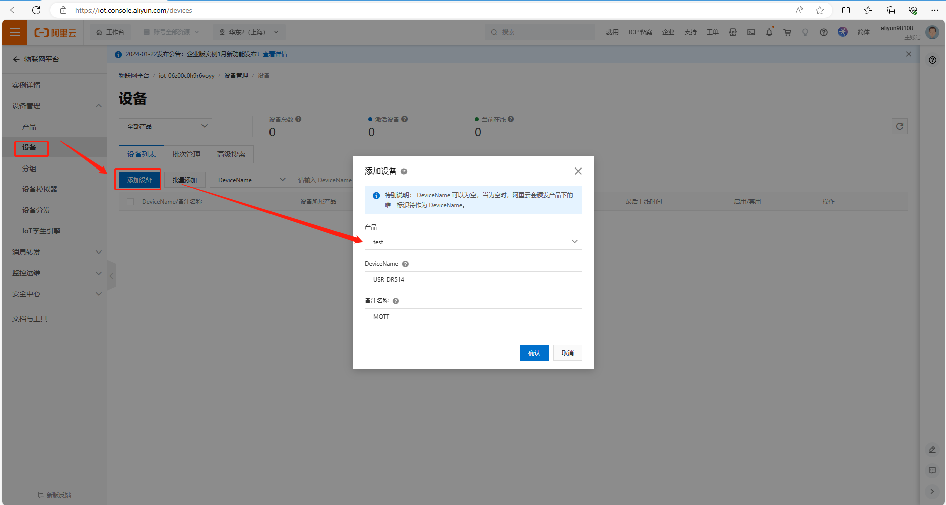 (1)產(chǎn)品創(chuàng)建成功后,添加設(shè)備。點(diǎn)擊設(shè)備,點(diǎn)擊添加設(shè)備,產(chǎn)品名舉例填test,DeviceName填USR-DR514,備注名稱(chēng)填MQTT,點(diǎn)擊確認(rèn)。