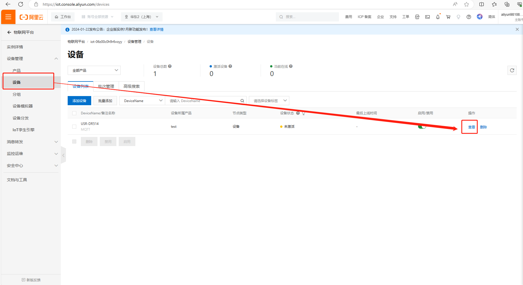 (2)登陸阿里云平臺(tái),點(diǎn)擊設(shè)備,點(diǎn)擊查看