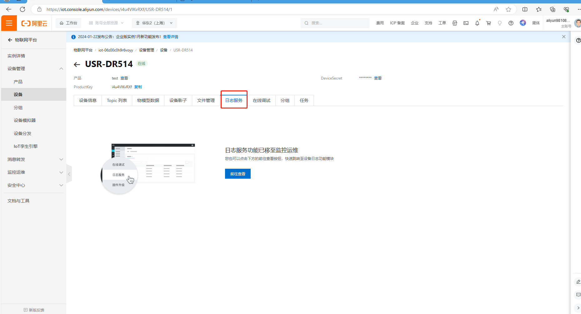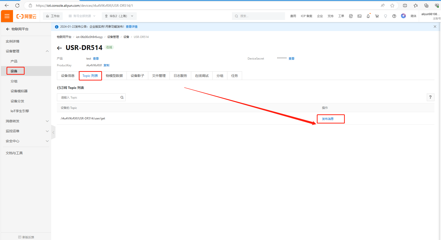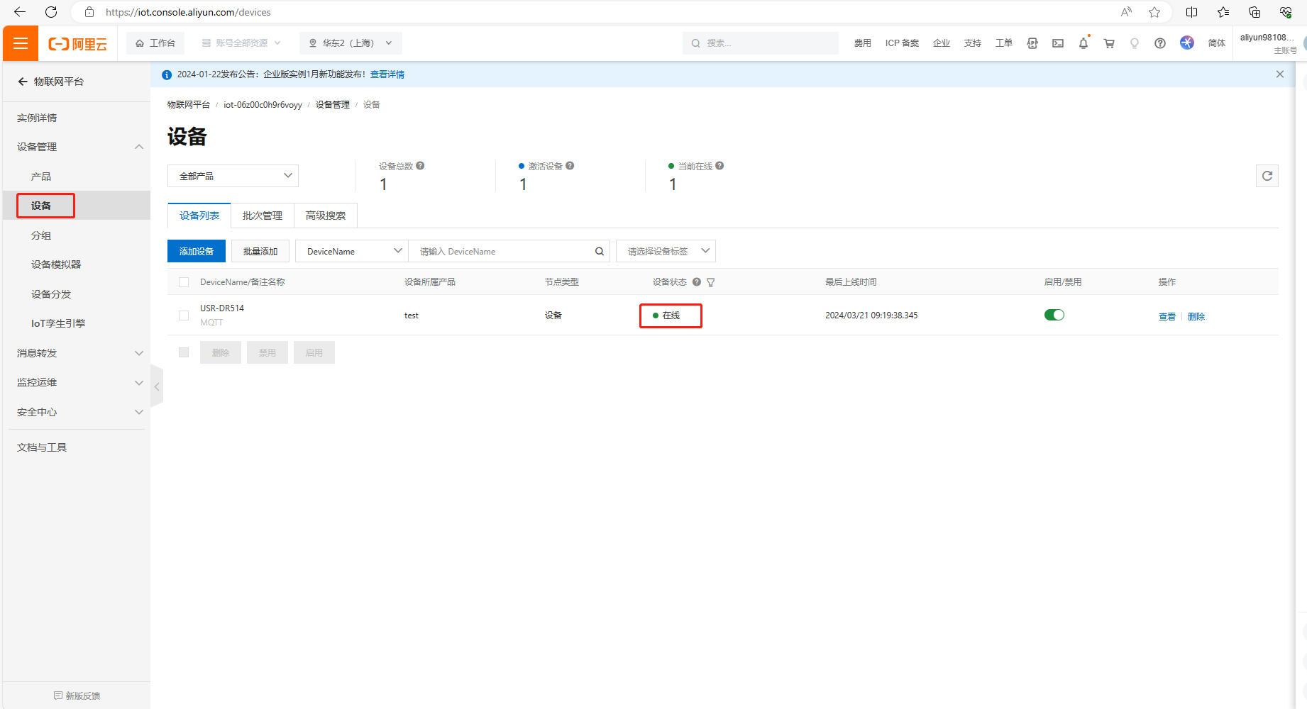 USR-DR514 設(shè)置完MQTT連接阿里云參數(shù),聯(lián)網(wǎng)正常,在阿里云平臺(tái)可以看到設(shè)備狀態(tài)是在線。