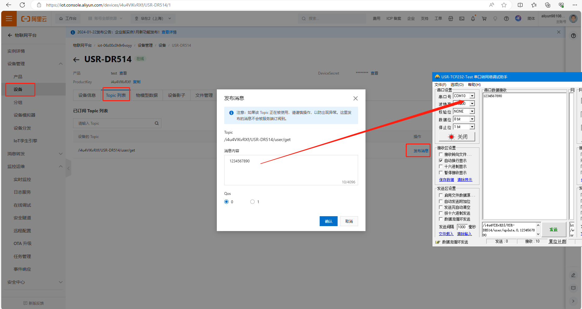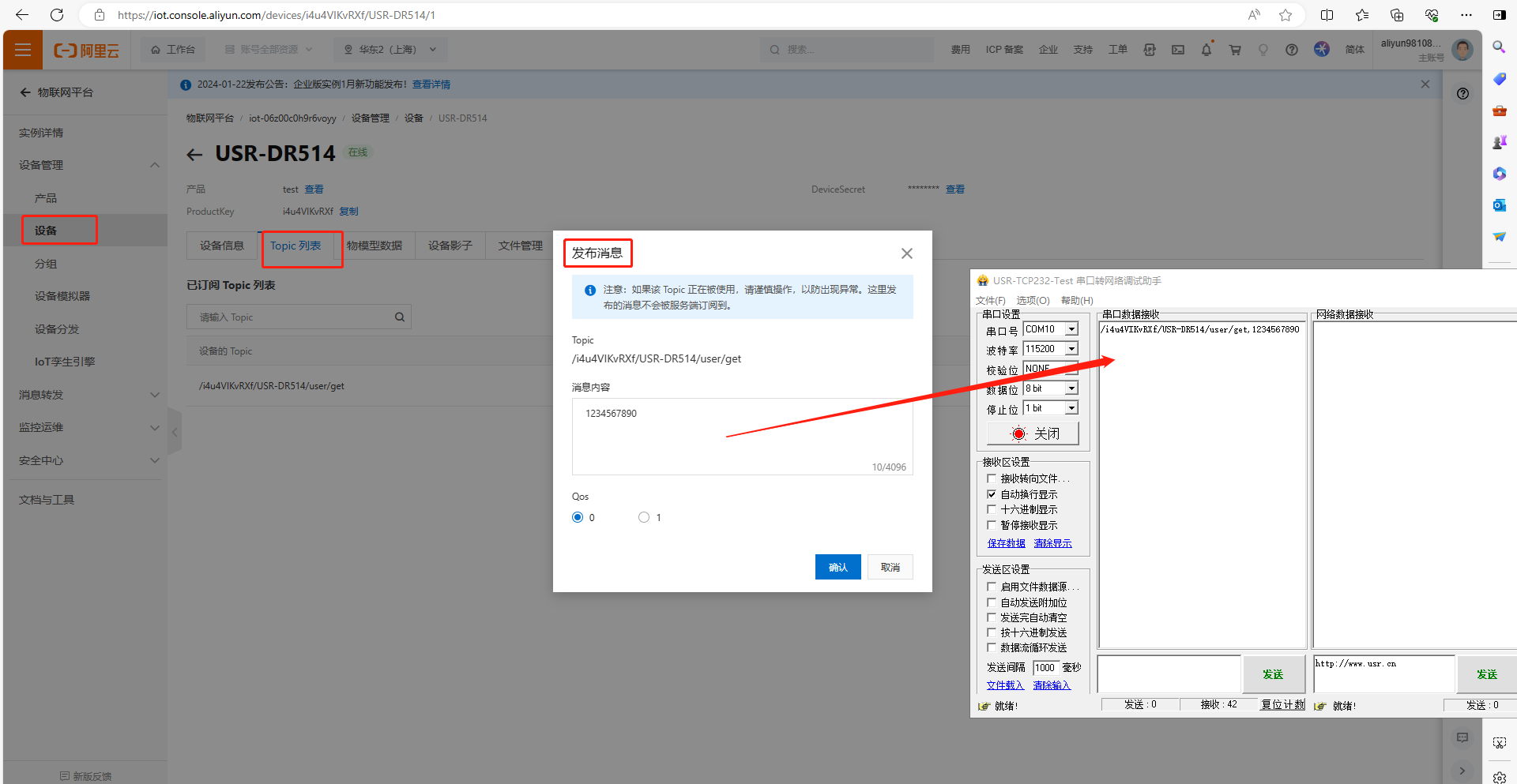 (4)使用阿里云平臺(tái)發(fā)布的消息www.lifj.com.cn,被USR-DR514訂閱到,并通過(guò)USR-DR514串口發(fā)給串口端,數(shù)據(jù)格式是透?jìng)鳎谥纸邮盏臄?shù)據(jù)www.lifj.com.cn