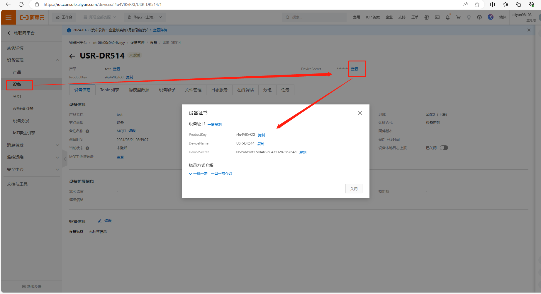 5、查看設(shè)備證書(shū)內(nèi)容,生成USR-DR514連接阿里云的用戶(hù)名
