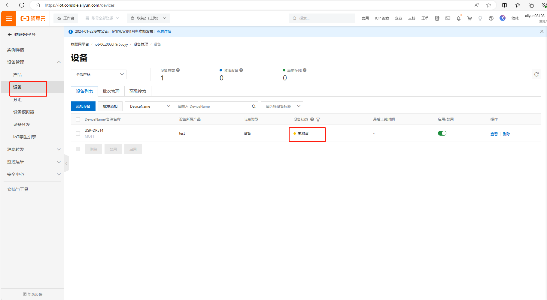 (2)添加完設(shè)備,如下圖展示,設(shè)備狀態(tài)是未激活,等設(shè)置完USR-DR514的MQTT連接阿里云參數(shù)之后,設(shè)備狀態(tài)才顯示在線。