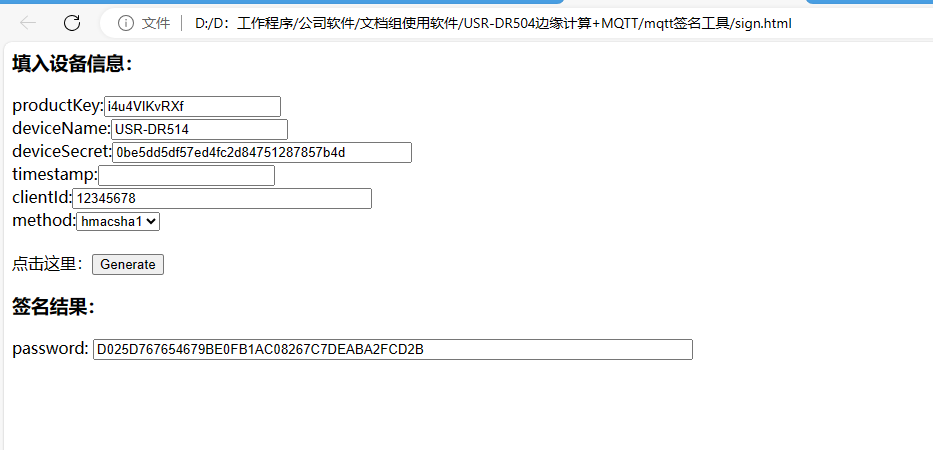 7、使用MQTT簽名工具,生成USR-DR514連接阿里云的密碼