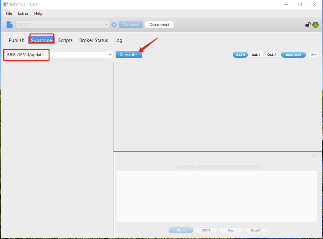 (2)MQTT.fx軟件點(diǎn)擊Subscribe,輸入/USR-DR514/update,點(diǎn)擊后面的Subscribe。