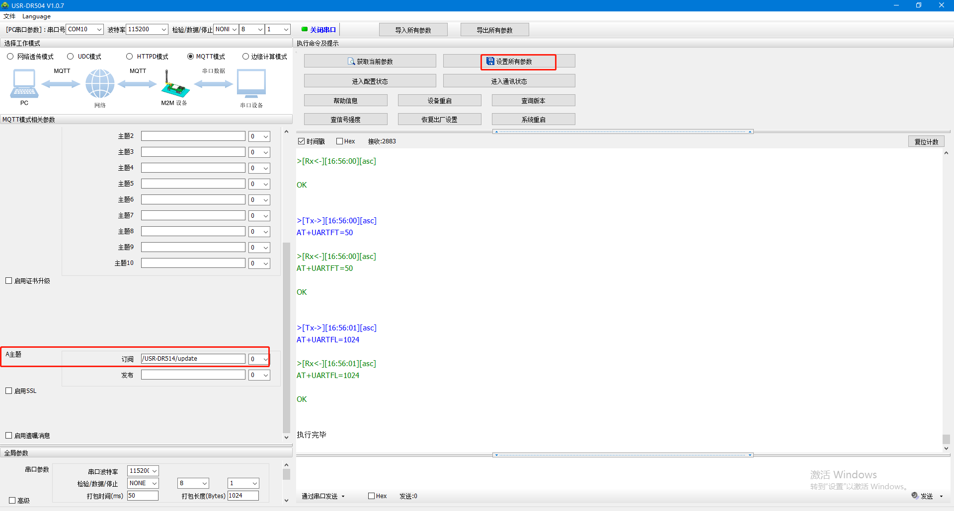 (8)A主題:發(fā)布主題,填寫/USR-DR514/update,設(shè)置軟件點(diǎn)擊設(shè)置所有參數(shù),