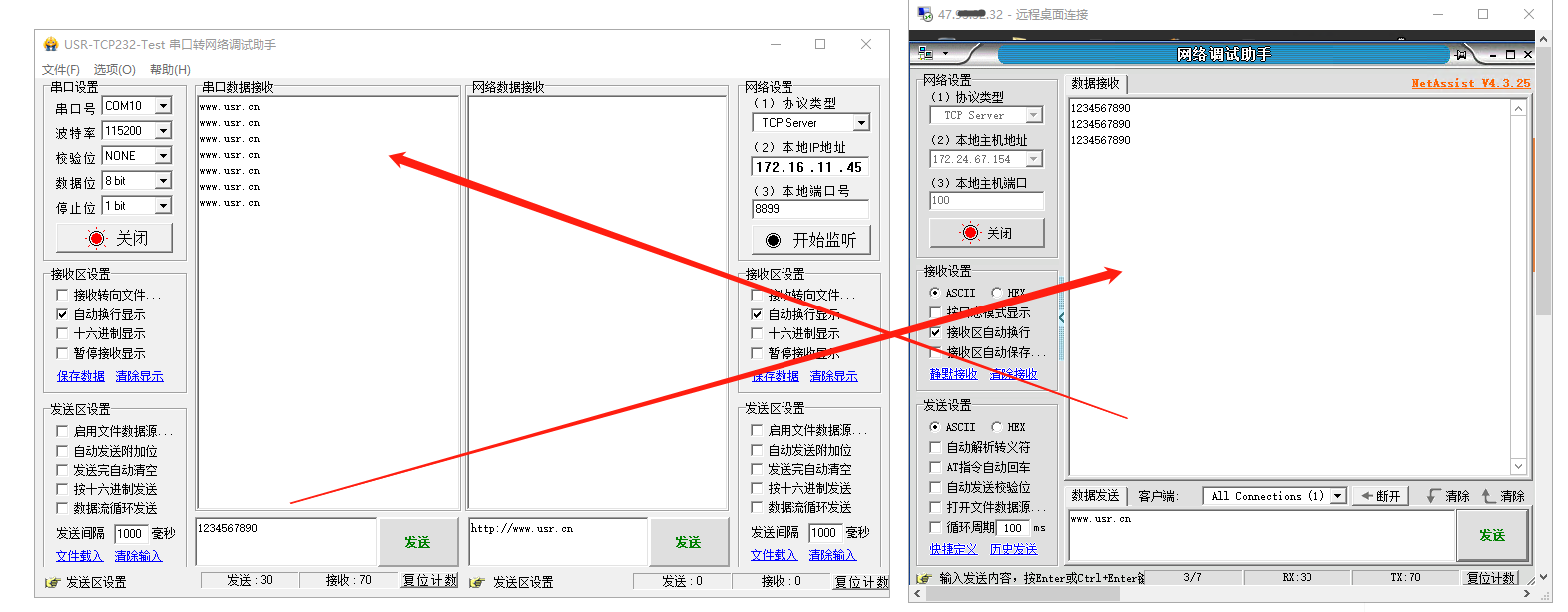 3、USR-DR514串口發(fā)送數(shù)據(jù)1234567890到遠(yuǎn)程服務(wù)器,遠(yuǎn)程服務(wù)器發(fā)送數(shù)據(jù)www.lifj.com.cn到串口,可以實現(xiàn)串口和網(wǎng)絡(luò)之間的數(shù)據(jù)雙向通訊。