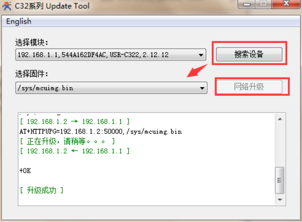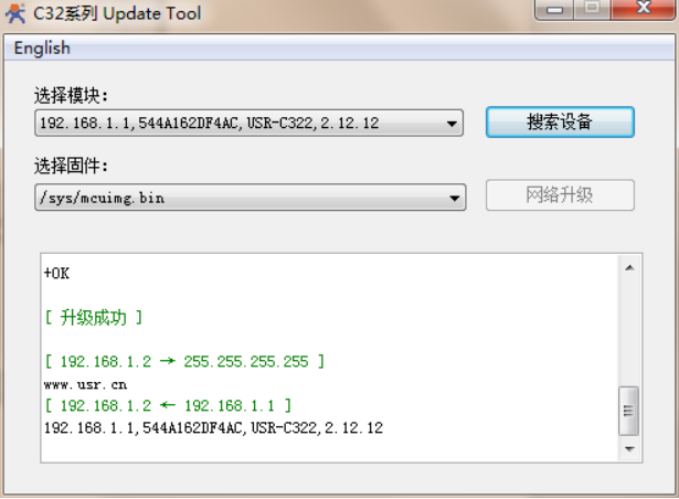 2.打開(kāi)升級(jí)工具(聯(lián)系客服人員獲?。c(diǎn)擊搜索設(shè)備,下拉選擇固件/sys/mcuimg.bin,點(diǎn)擊網(wǎng)絡(luò)升級(jí)
