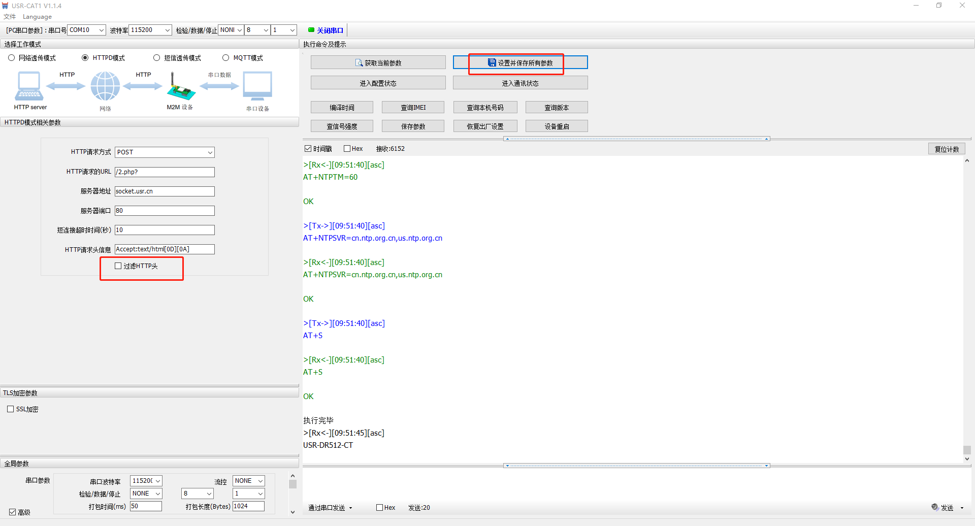 3、USR-DR512使用設(shè)置軟件進(jìn)入配置狀態(tài),讀取當(dāng)前參數(shù),取消勾選過(guò)濾HTTP頭,設(shè)置并保存所有參數(shù)設(shè)置。