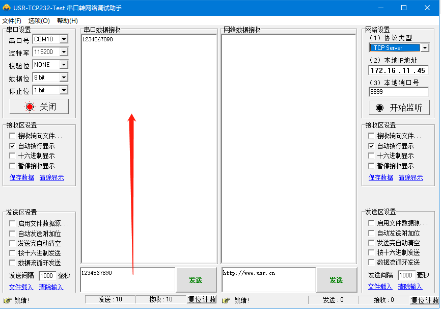 2、USR-DR512串口發(fā)送數(shù)據(jù)1234567890到HTTPD測(cè)試服務(wù)器,HTTPD測(cè)試服務(wù)器返回?cái)?shù)據(jù)1234567890到串口,串口接收的數(shù)據(jù)過(guò)濾報(bào)頭,只展示數(shù)據(jù)1234567890。證明USR-DR512的HTTPD POST功能正常。