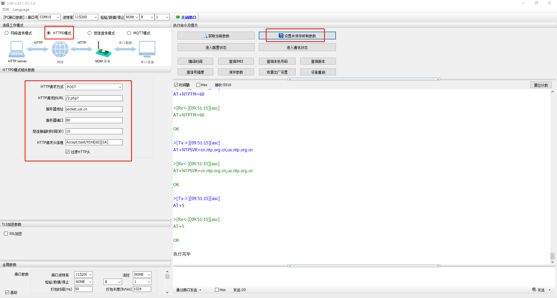 4、勾選HTTPD模式,設(shè)置HTTPD模式相關(guān)參數(shù),點(diǎn)擊設(shè)置并保存所有參數(shù)。USR-DR512參數(shù)保存并重啟。
