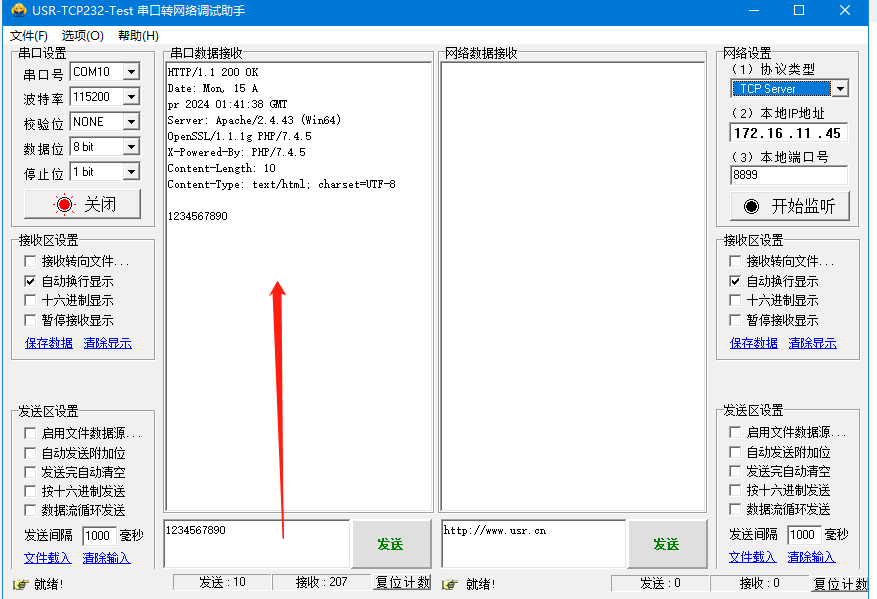 4、USR-DR512串口發(fā)送數(shù)據(jù)1234567890到HTTPD測(cè)試服務(wù)器,HTTPD測(cè)試服務(wù)器返回?cái)?shù)據(jù)帶報(bào)頭到串口。