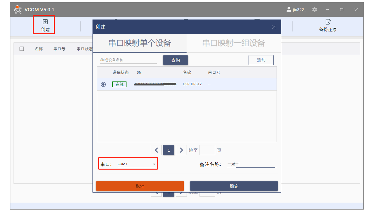 選擇串口映射單個(gè)設(shè)備,勾選在線(xiàn)的USR-DR512,用空閑的COM7作為虛擬串口的COM口號(hào),點(diǎn)擊確定。