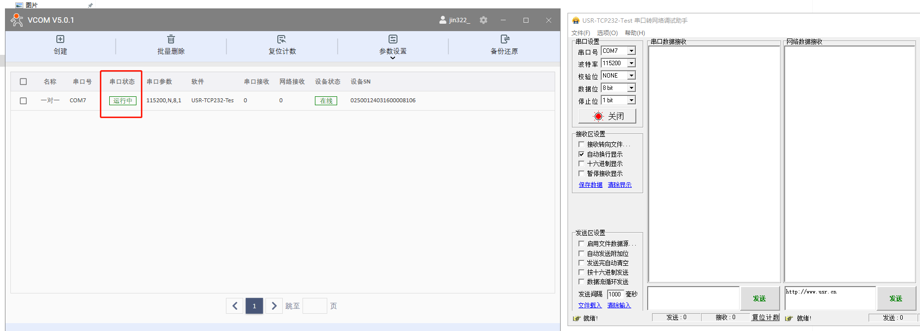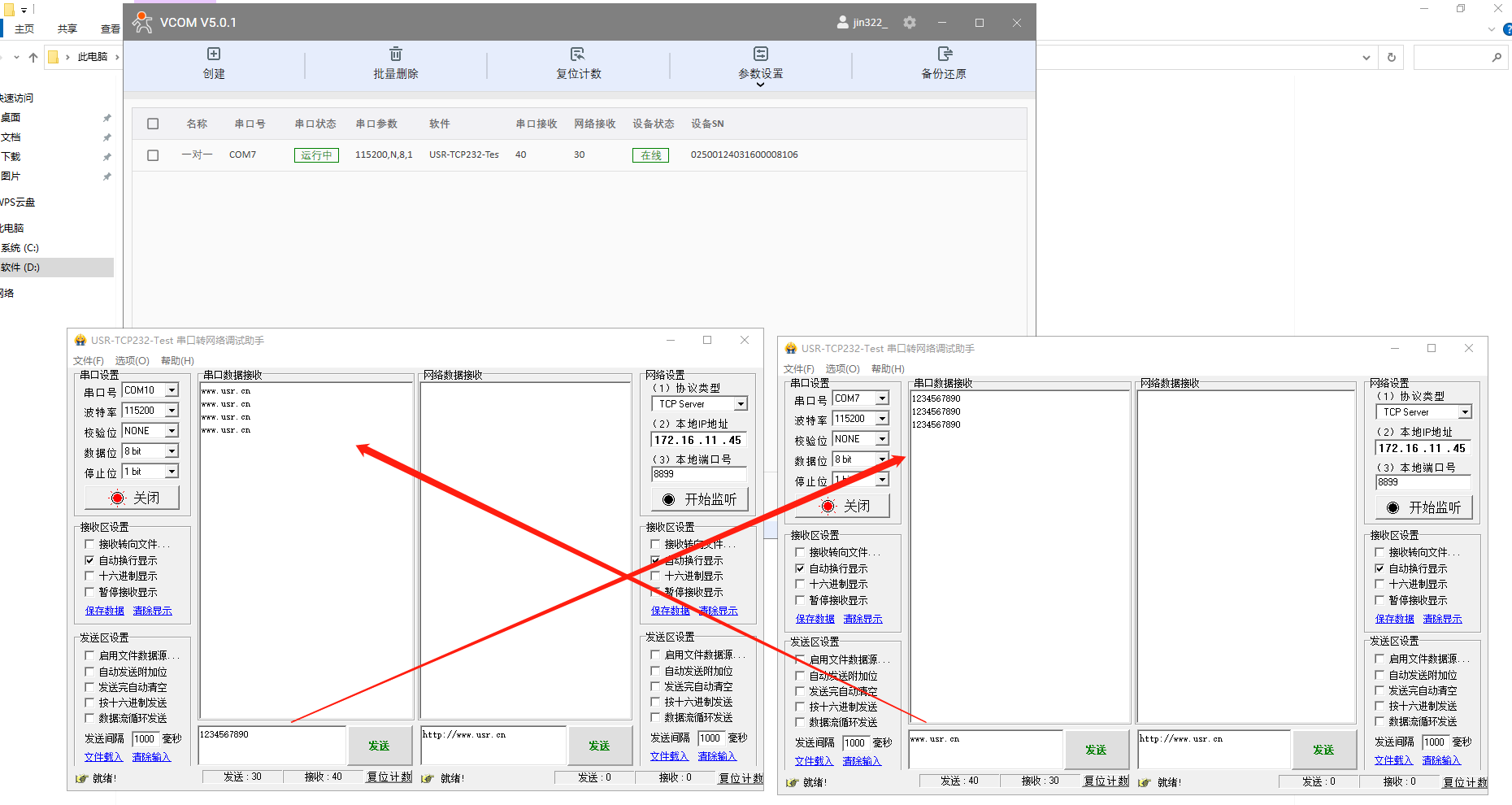 1、打開(kāi)2個(gè)串口助手,分別用USR-DR512實(shí)際USB串口COM10打開(kāi)串口,另一個(gè)串口助手用虛擬串口COM7打開(kāi)串口。
