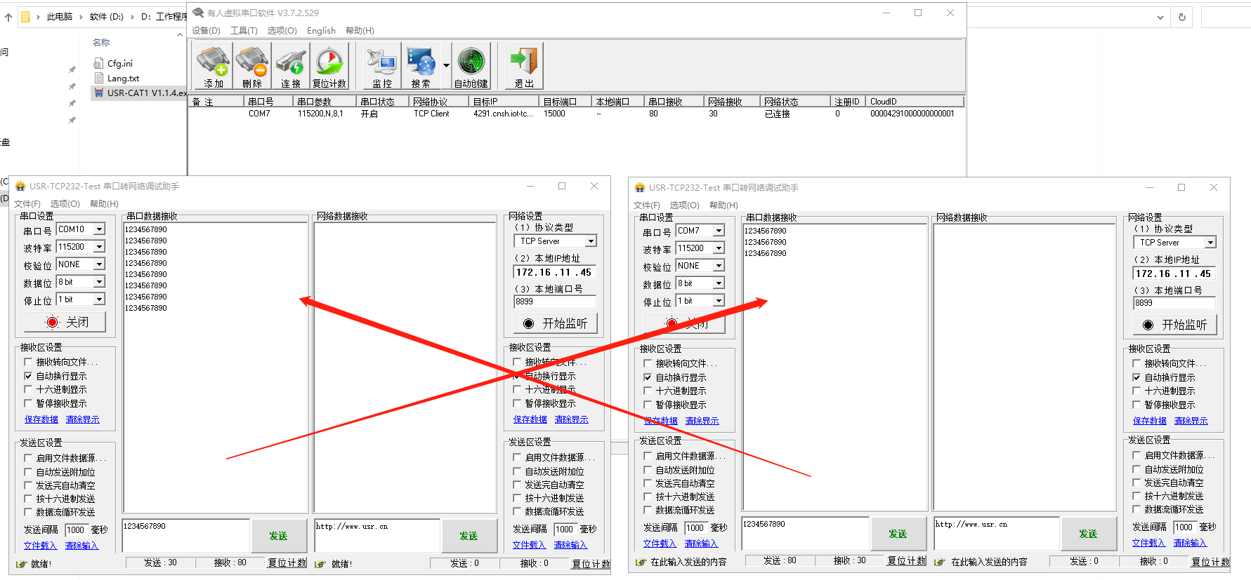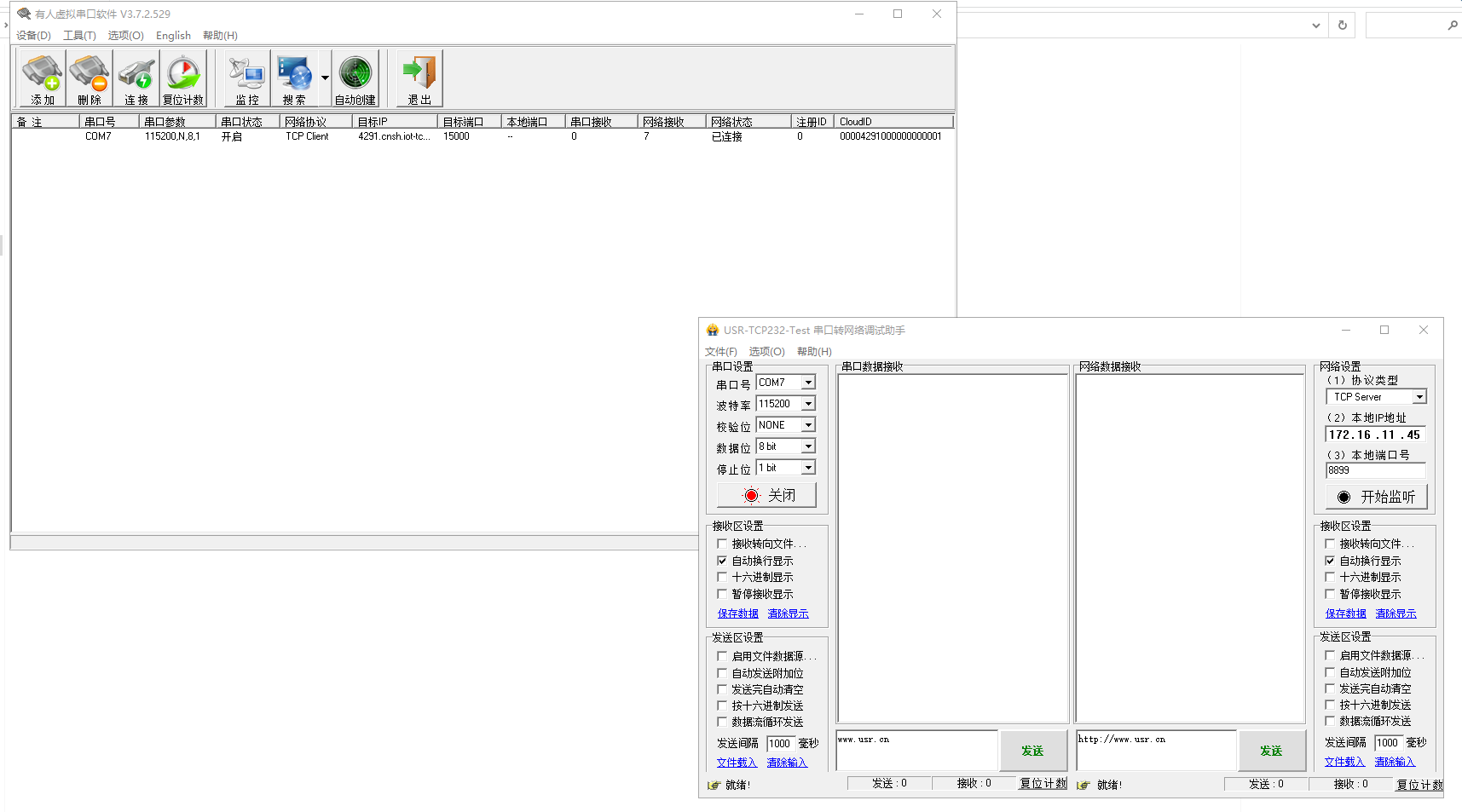 打開2個串口助手,分別用USR-DR512實際USB串口COM10打開串口,另一個串口助手用虛擬串口COM7打開串口。實際串口和虛擬串口之間測試數(shù)據(jù)通訊。