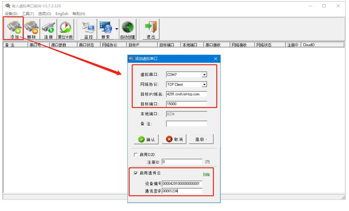 高級設(shè)置開啟透傳云,輸入有人云添加設(shè)備的編號ID 00004291000000000001和密碼00001234,點擊確認(rèn)。