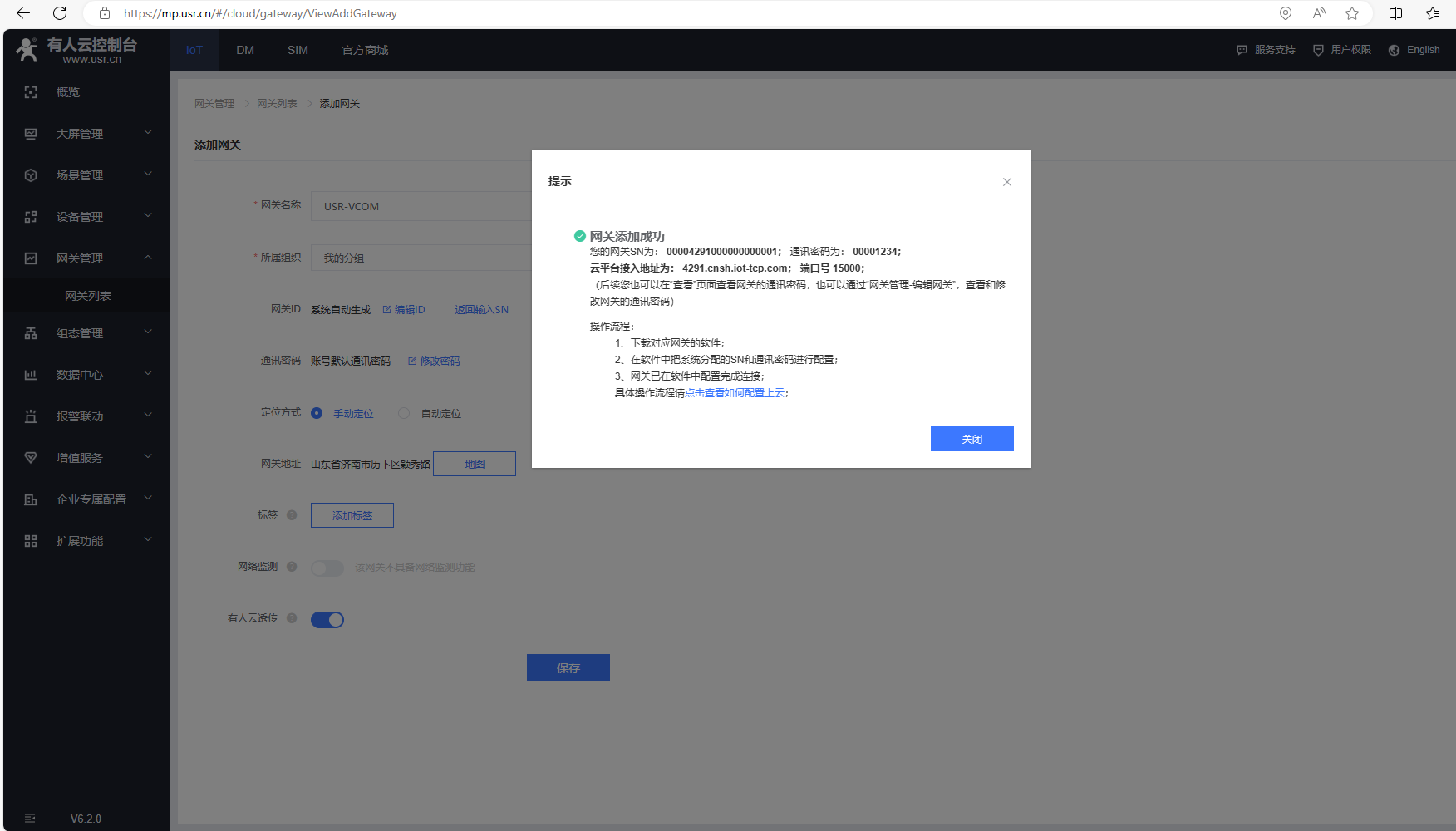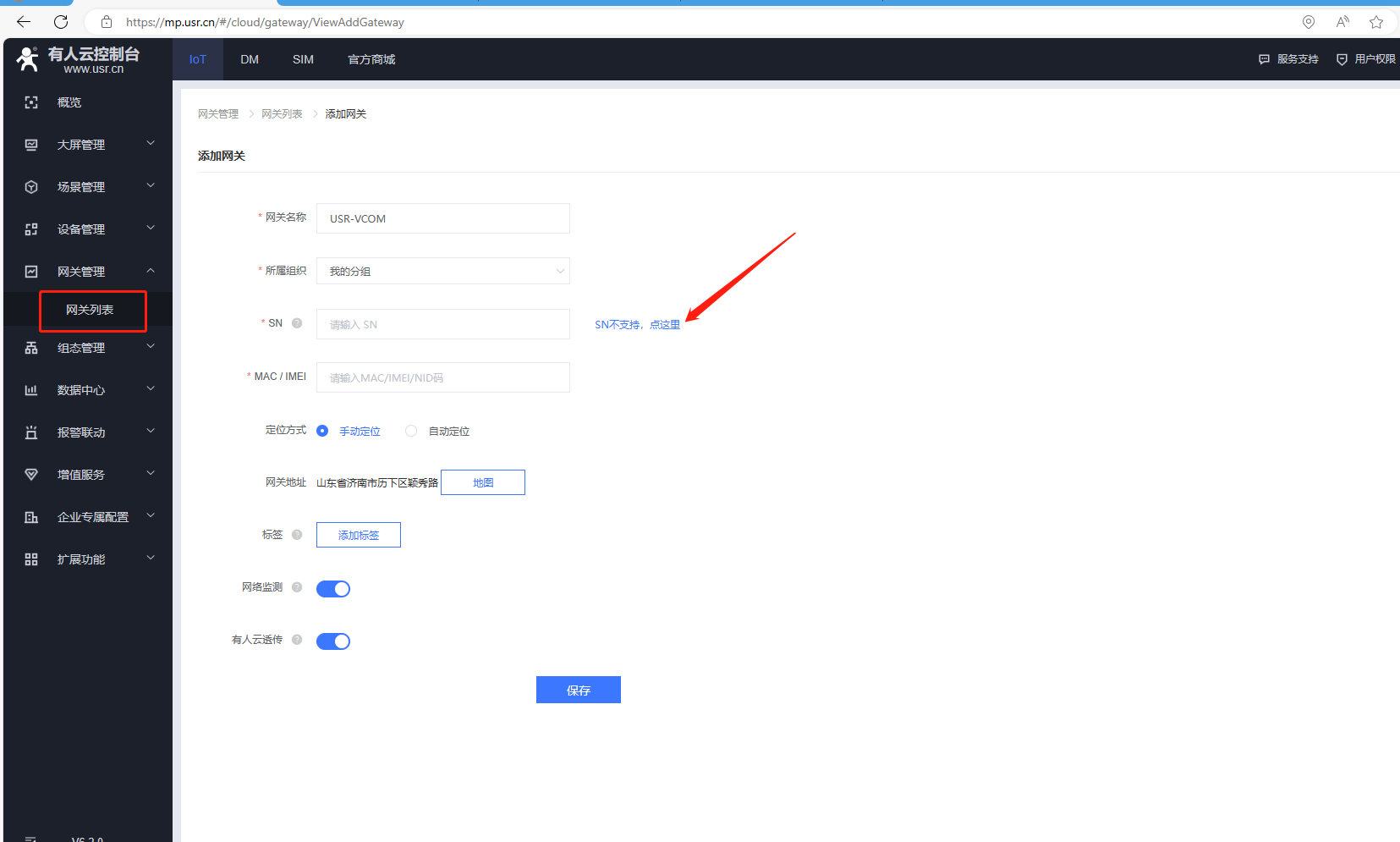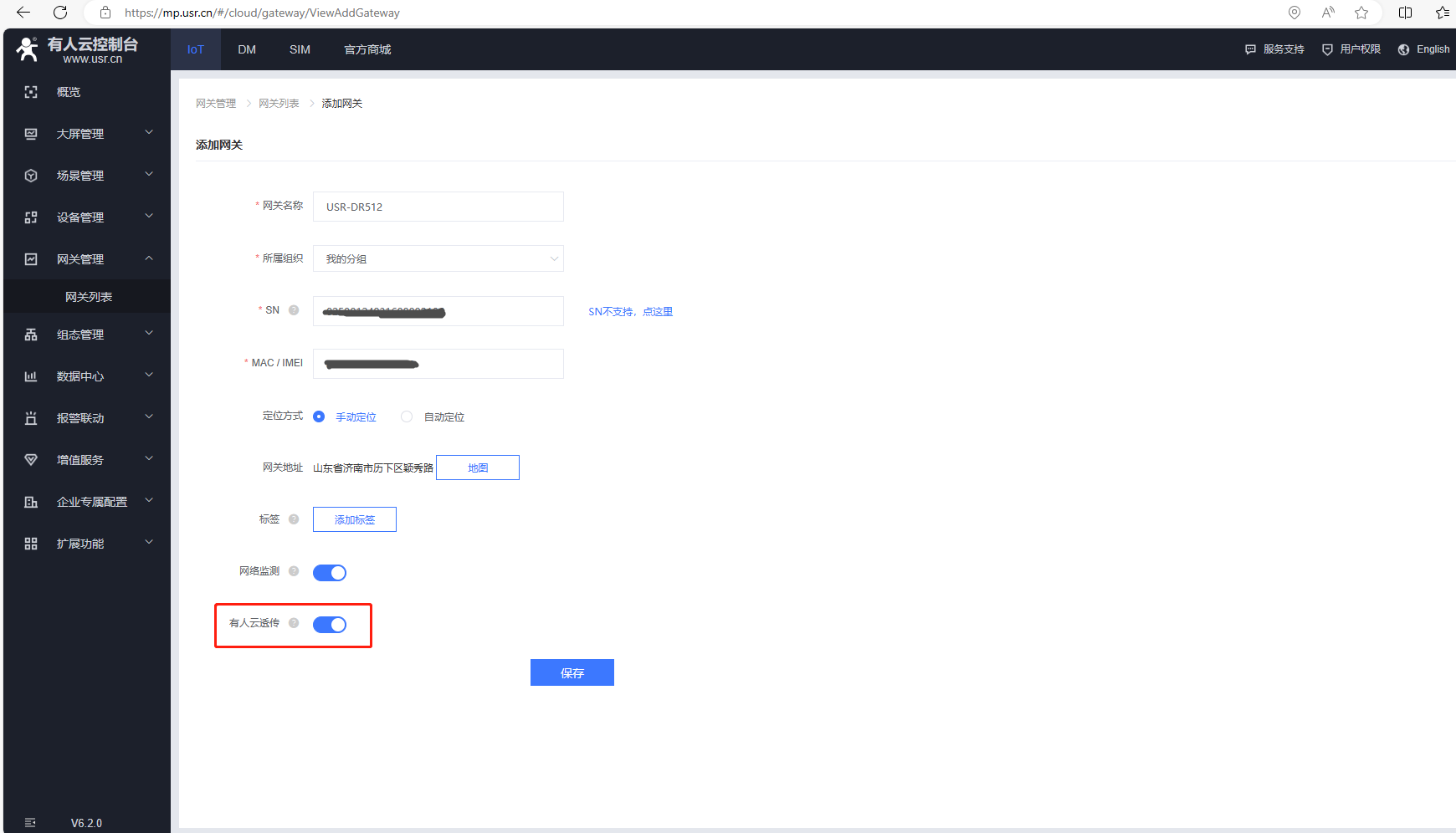 (2)USR-DR512查看產(chǎn)品反面標(biāo)簽,使用SN和IMEI在有人云上添加設(shè)備,和虛擬串口一對一通訊,有人云透傳需要勾選開啟,最后點擊保存。