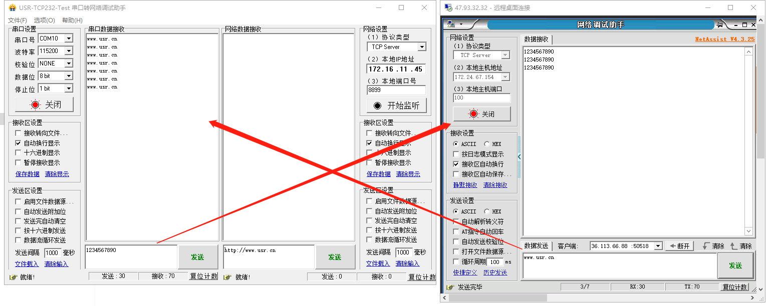 3、USR-DR512串口發(fā)送數(shù)據(jù)1234567890到遠(yuǎn)程服務(wù)器,遠(yuǎn)程服務(wù)器發(fā)送數(shù)據(jù)www.lifj.com.cn到串口,可以實(shí)現(xiàn)串口和網(wǎng)絡(luò)之間的數(shù)據(jù)雙向通訊。