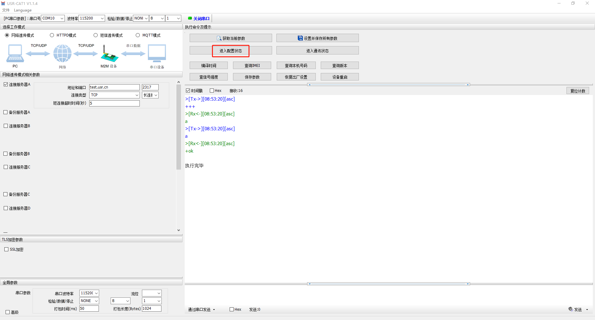 2、打開USB-RS485串口線COM口,設(shè)置軟件波特率和USR-DR512波特率一致,點(diǎn)擊進(jìn)入配置狀態(tài)。