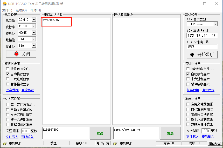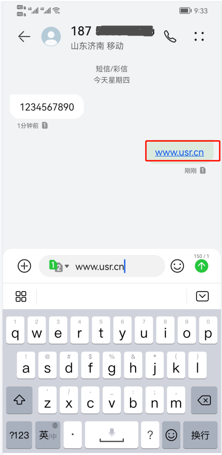 1、USR-DR512串口接USB-RS485串口線,打開USR-TCP485-TEST串口助手,打開串口,發(fā)送數(shù)據(jù)1234567890,目標(biāo)手機號收到短信。