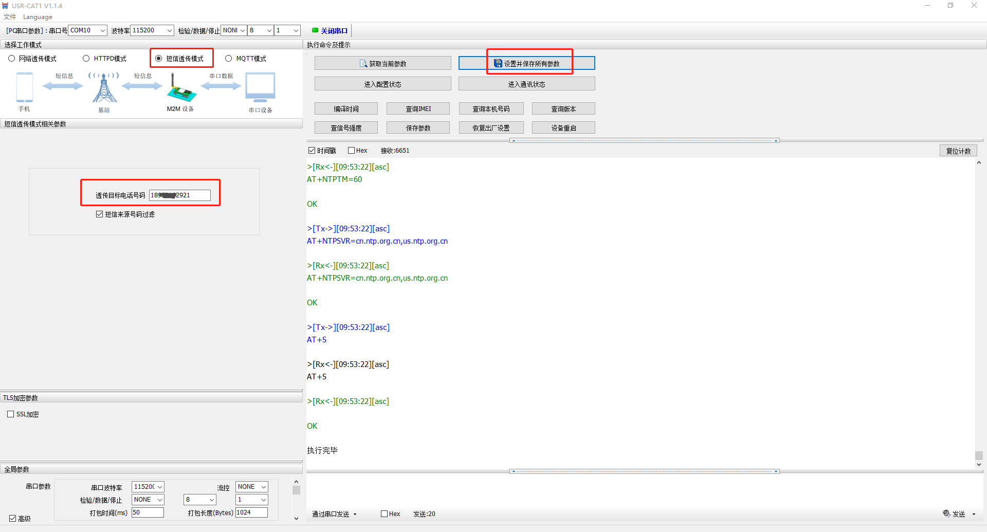 4、勾選短信透傳模式,輸入透傳目標(biāo)電話號碼,點擊設(shè)置并保存所有參數(shù)。USR-DR512參數(shù)保存并重啟。