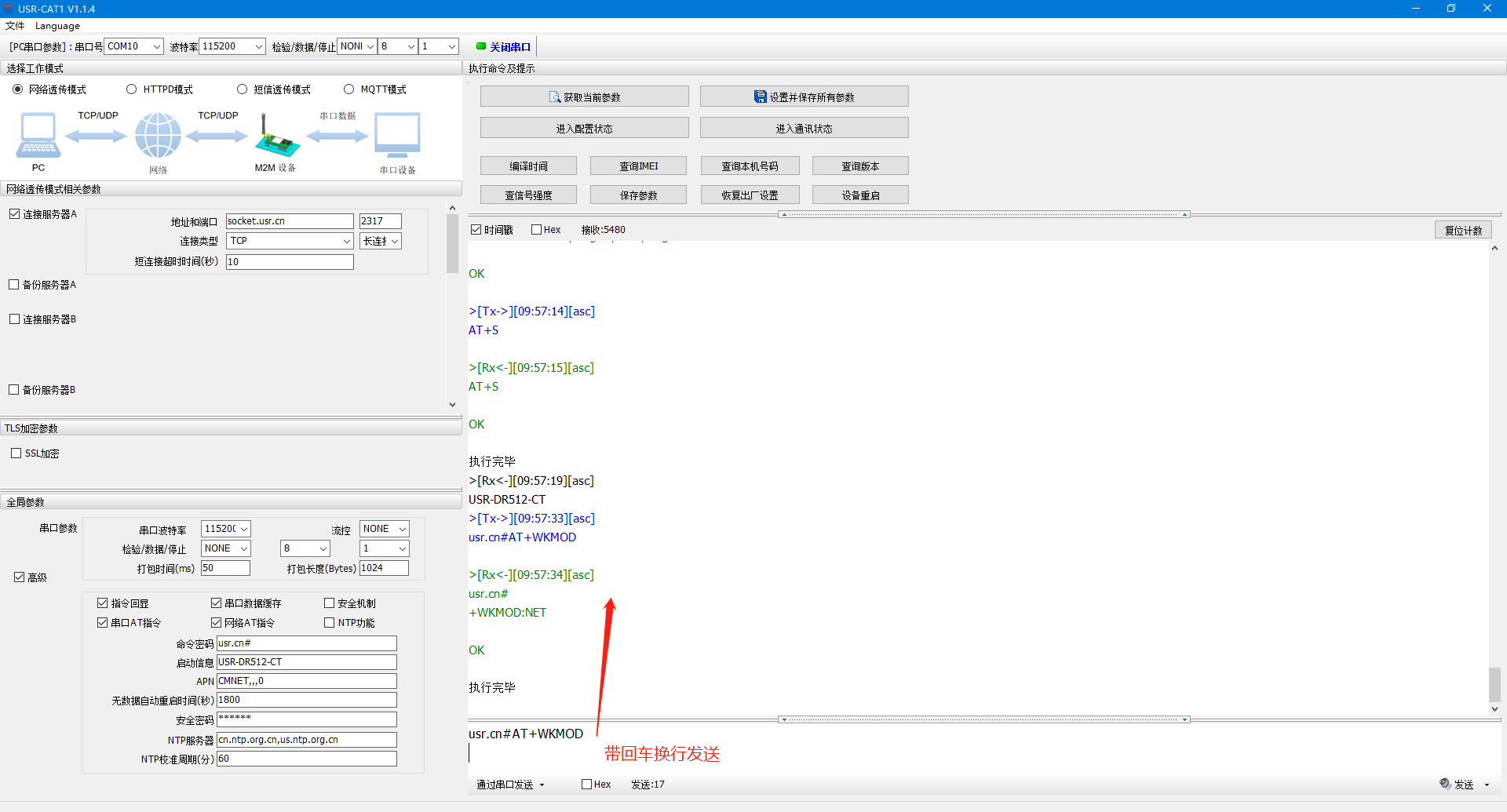 在進(jìn)入通訊狀態(tài)時(shí),打開串口助手COM10,串口參數(shù)和USR-DR512串口參數(shù)設(shè)置一致,發(fā)送usr.cn#AT+WKMOD后面帶回車換行發(fā)送,串口可以查詢到工作模式。