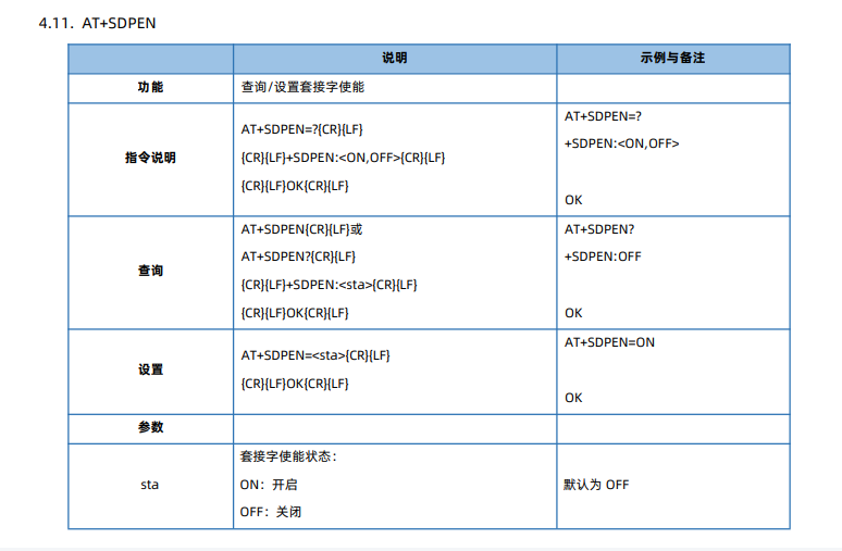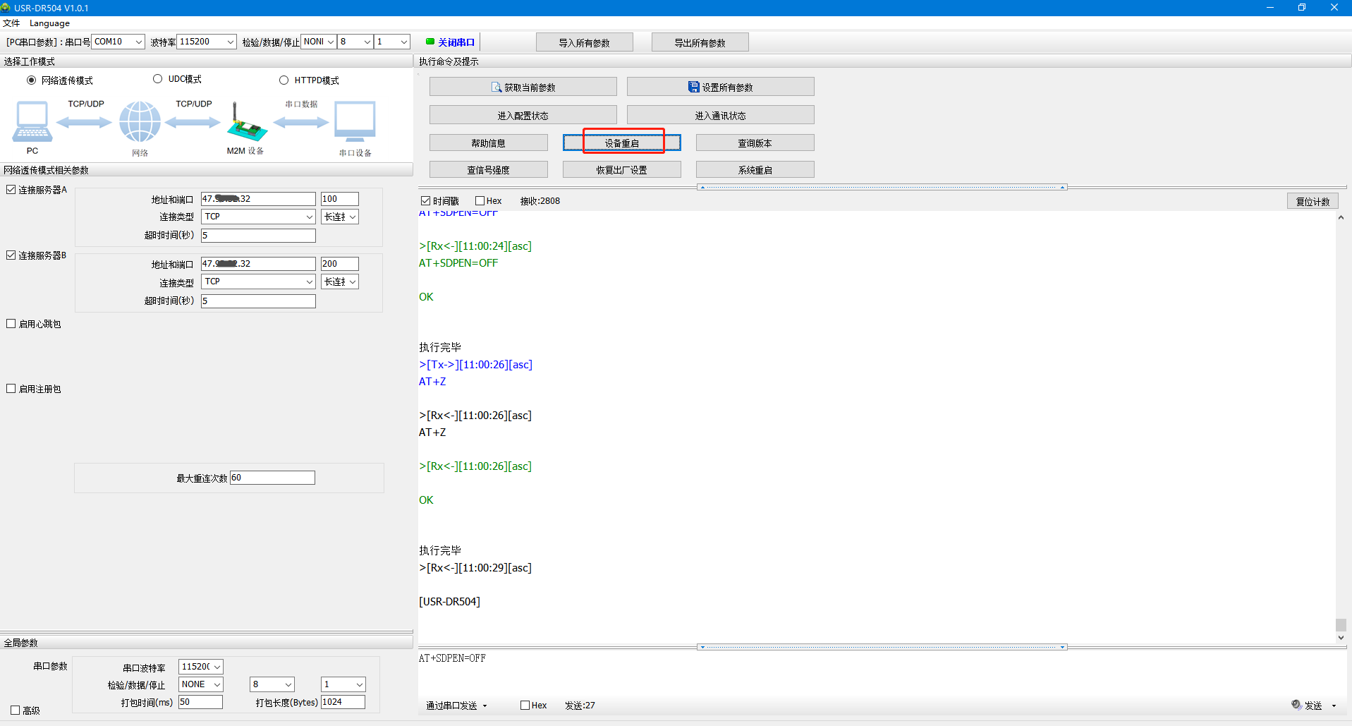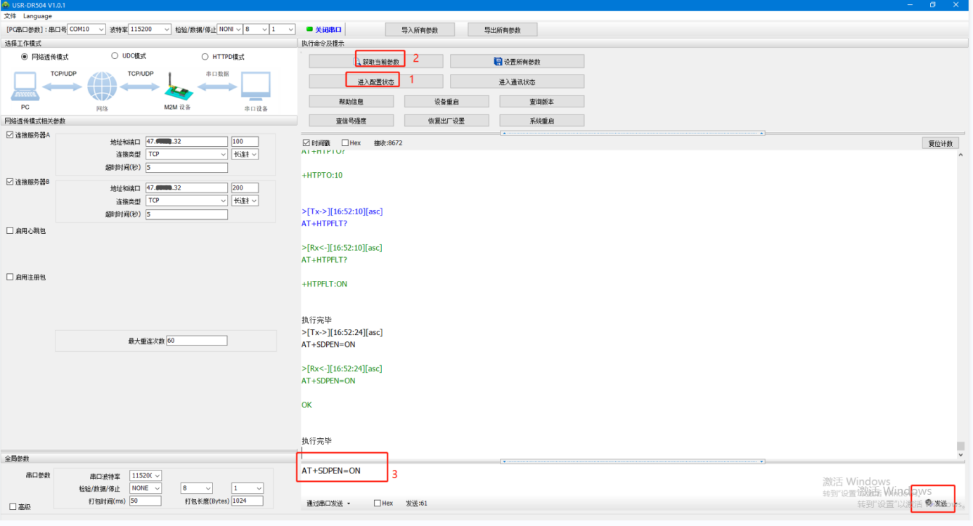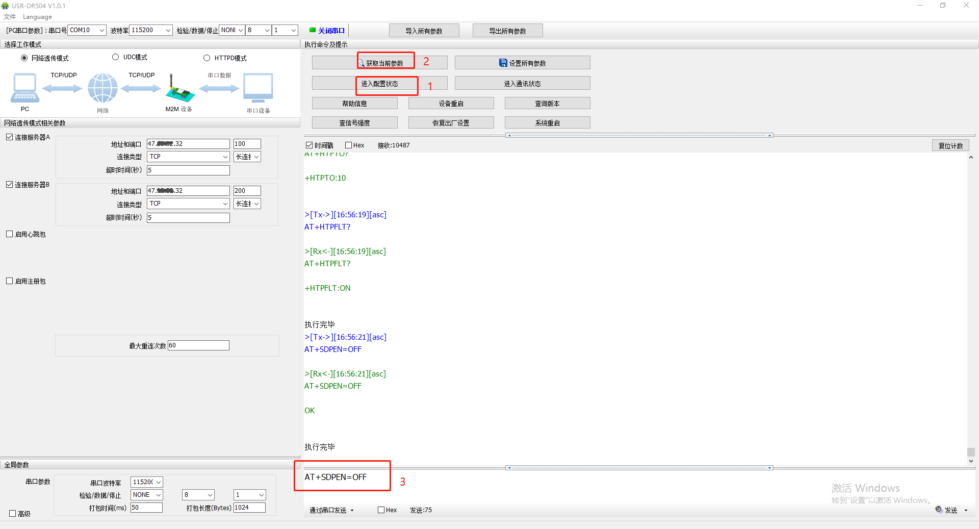5、串口再次進(jìn)入配置狀態(tài),獲取當(dāng)前參數(shù),發(fā)送AT指令A(yù)T+SDPEN=ON開(kāi)啟套接字分發(fā)功能,點(diǎn)擊設(shè)備重啟,保存參數(shù)設(shè)置。