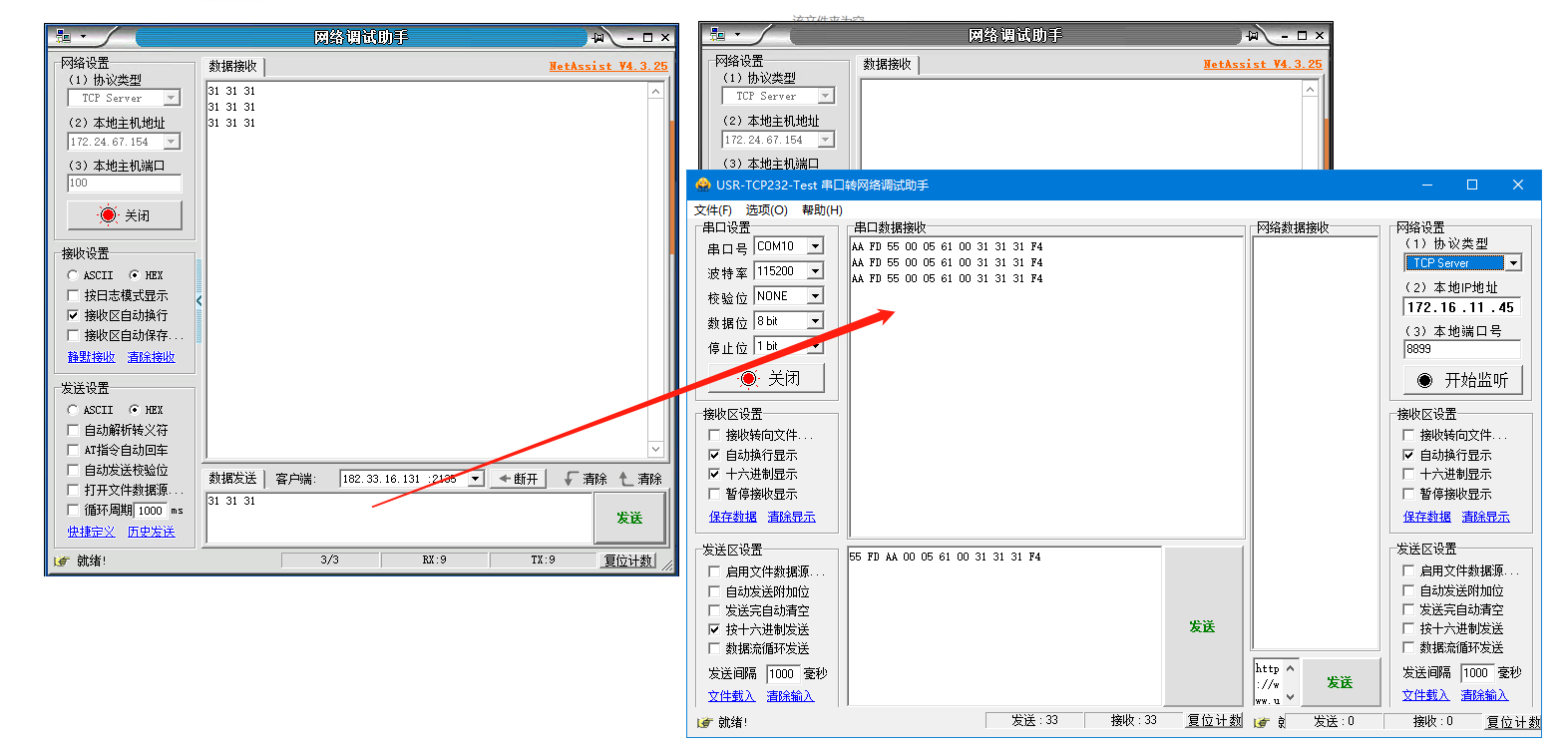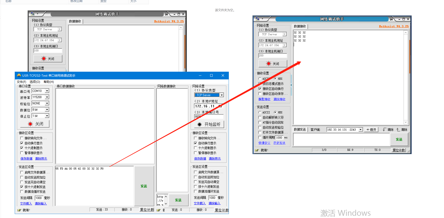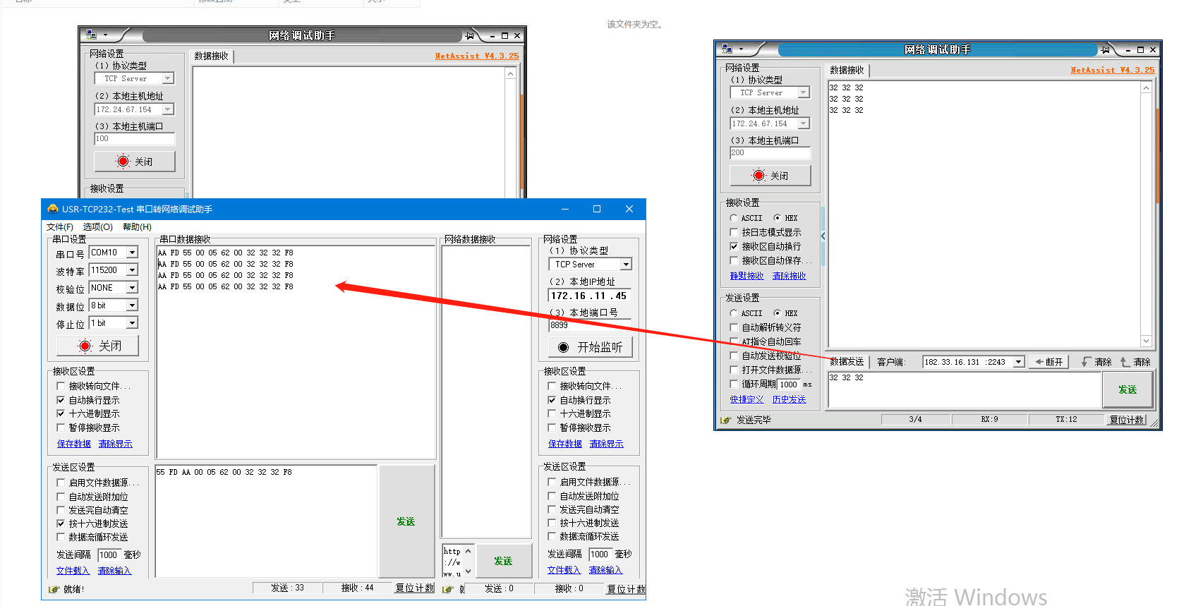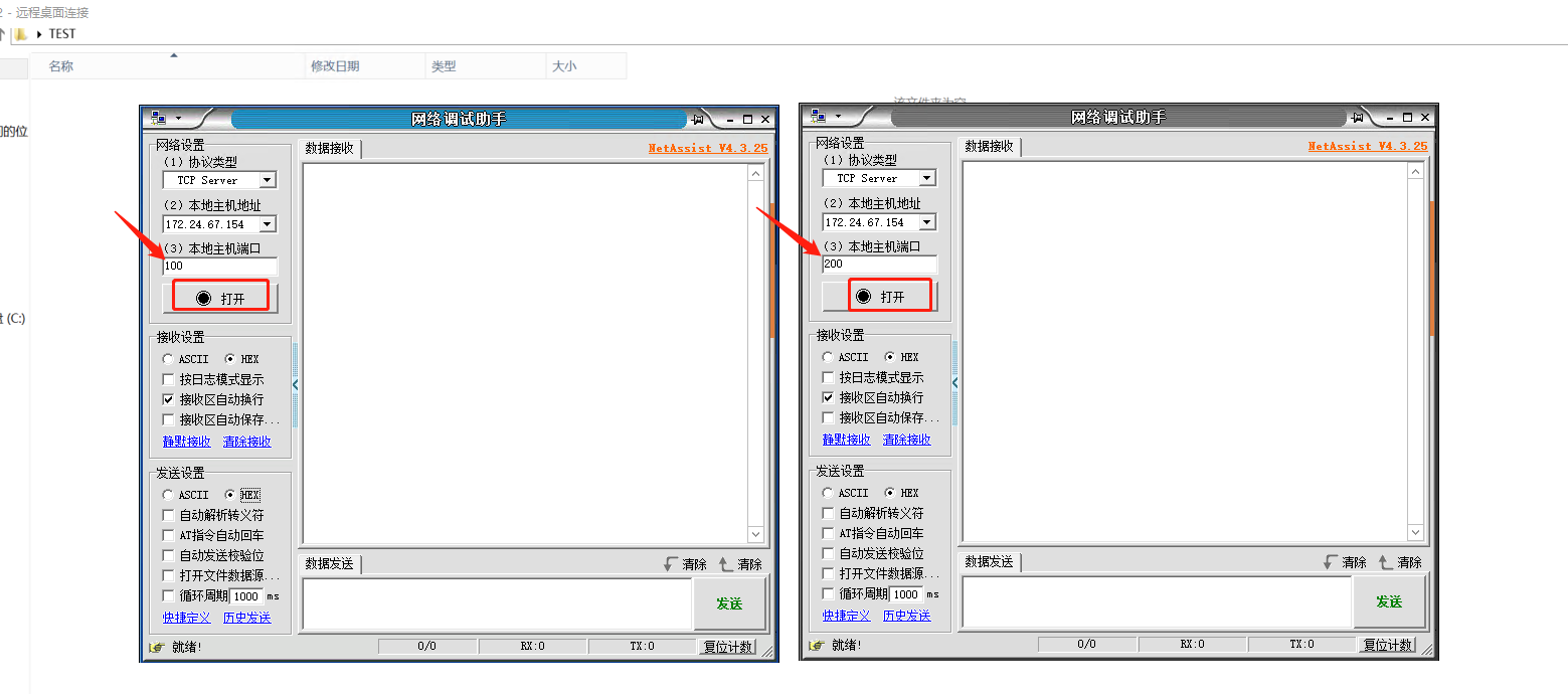 1、登錄遠(yuǎn)程服務(wù)器,打開(kāi)2個(gè)網(wǎng)絡(luò)助手,分別使用2個(gè)端口100、200,點(diǎn)擊連接。USR-DR504會(huì)和2個(gè)網(wǎng)絡(luò)助手建立TCP連接。