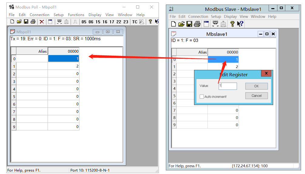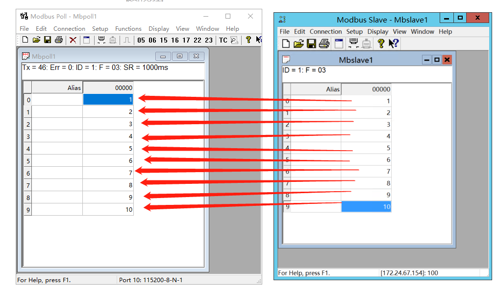 (1)改變MODBUS SLAVE寄存器地址里面的數(shù)據(jù),對(duì)應(yīng)寄存器地址的MODBUS POLL軟件可以正常讀取。