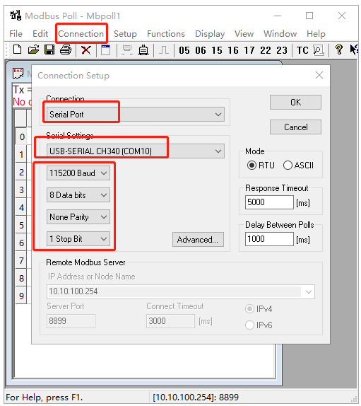 4、Modbus Poll軟件,點(diǎn)擊Connection,選擇Serial Port,選擇對(duì)應(yīng)的COM口COM10,對(duì)應(yīng)USR-DR504的串口參數(shù),最后點(diǎn)擊OK。