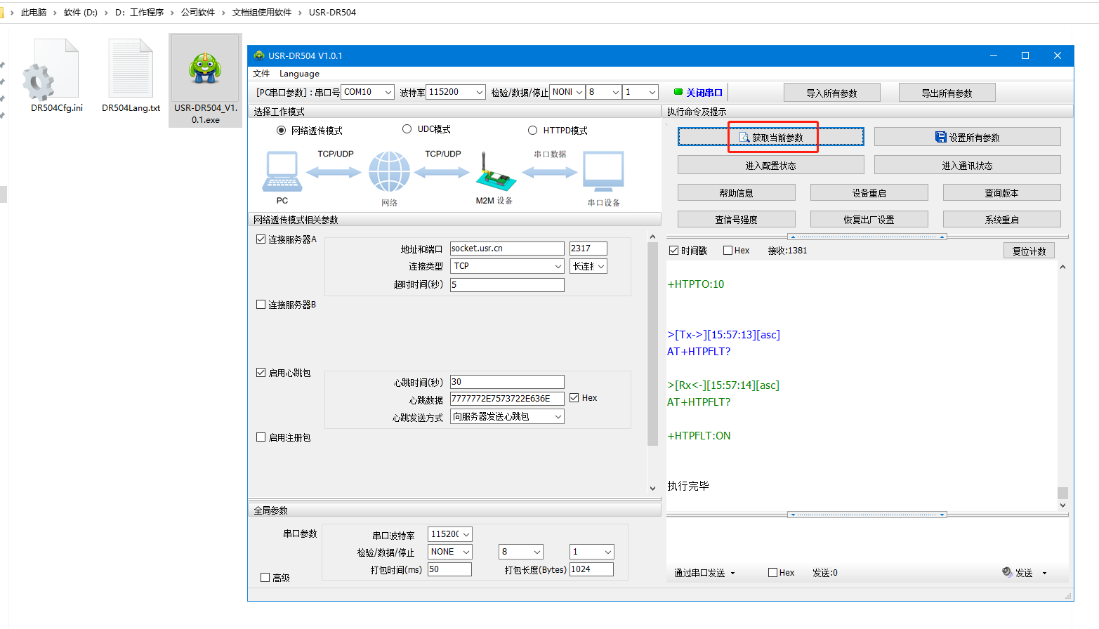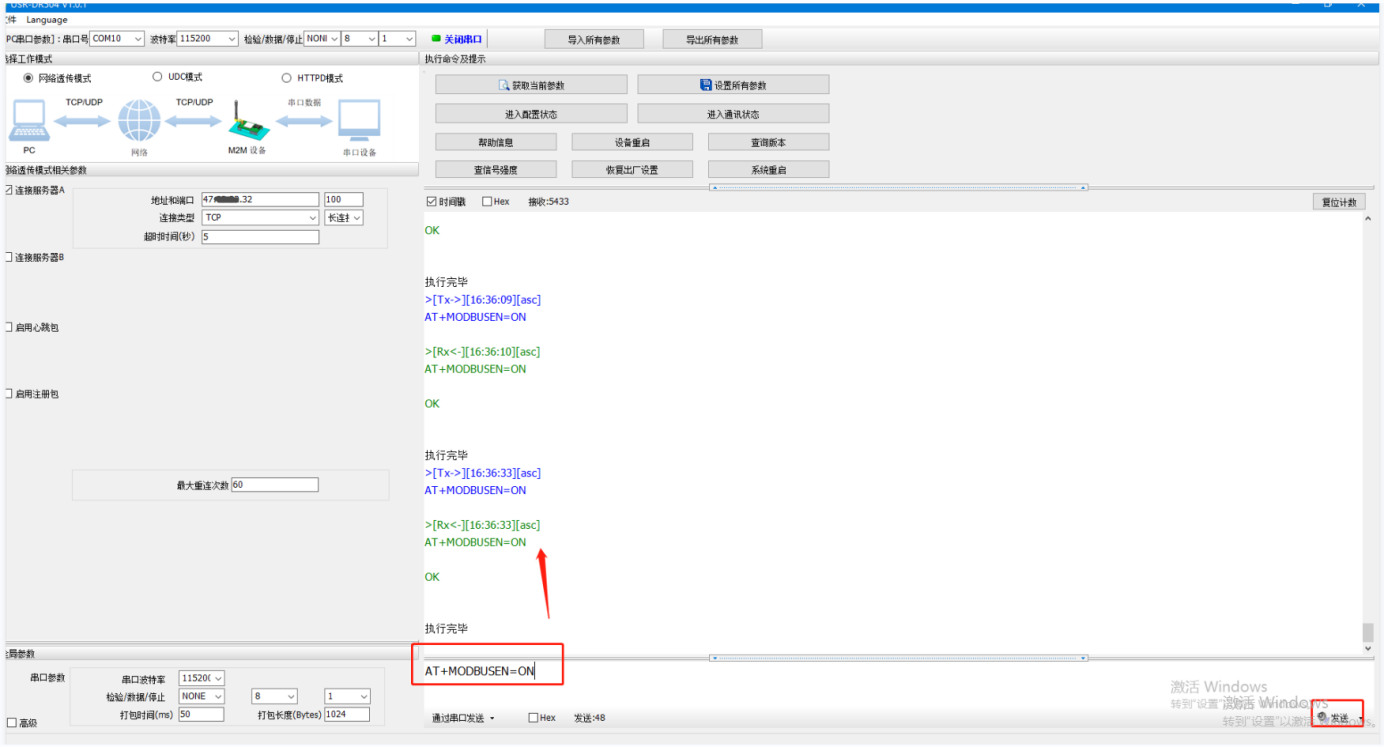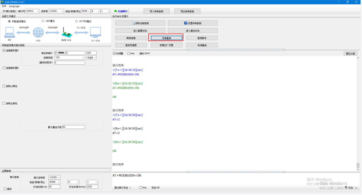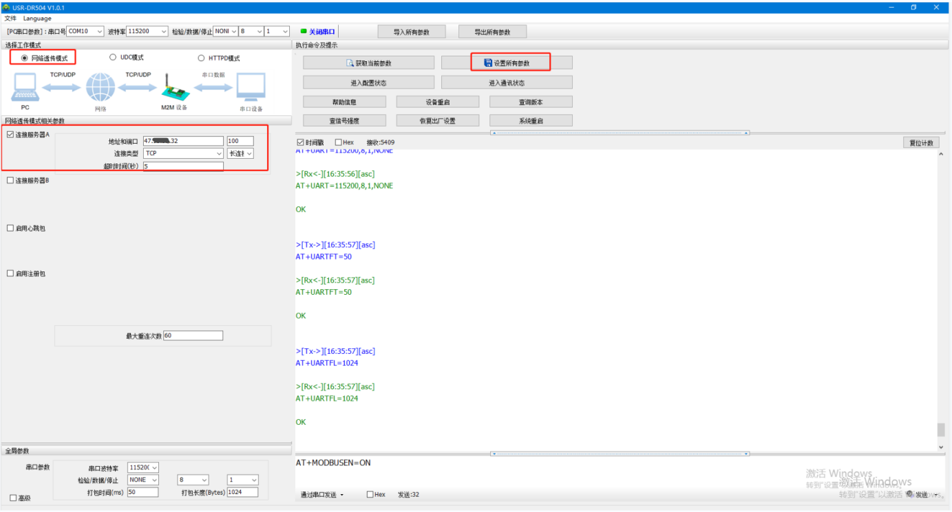 4、選擇網(wǎng)絡(luò)透?jìng)髂J?,連接服務(wù)器A,地址輸入要連接的遠(yuǎn)程服務(wù)器地址,端口用100,點(diǎn)擊設(shè)置所有參數(shù),發(fā)送區(qū)輸入一條開(kāi)啟 Modbus 協(xié)議轉(zhuǎn)換功能的AT指令A(yù)T+MODBUSEN=ON,點(diǎn)擊發(fā)送。發(fā)送完,點(diǎn)擊設(shè)備重啟。