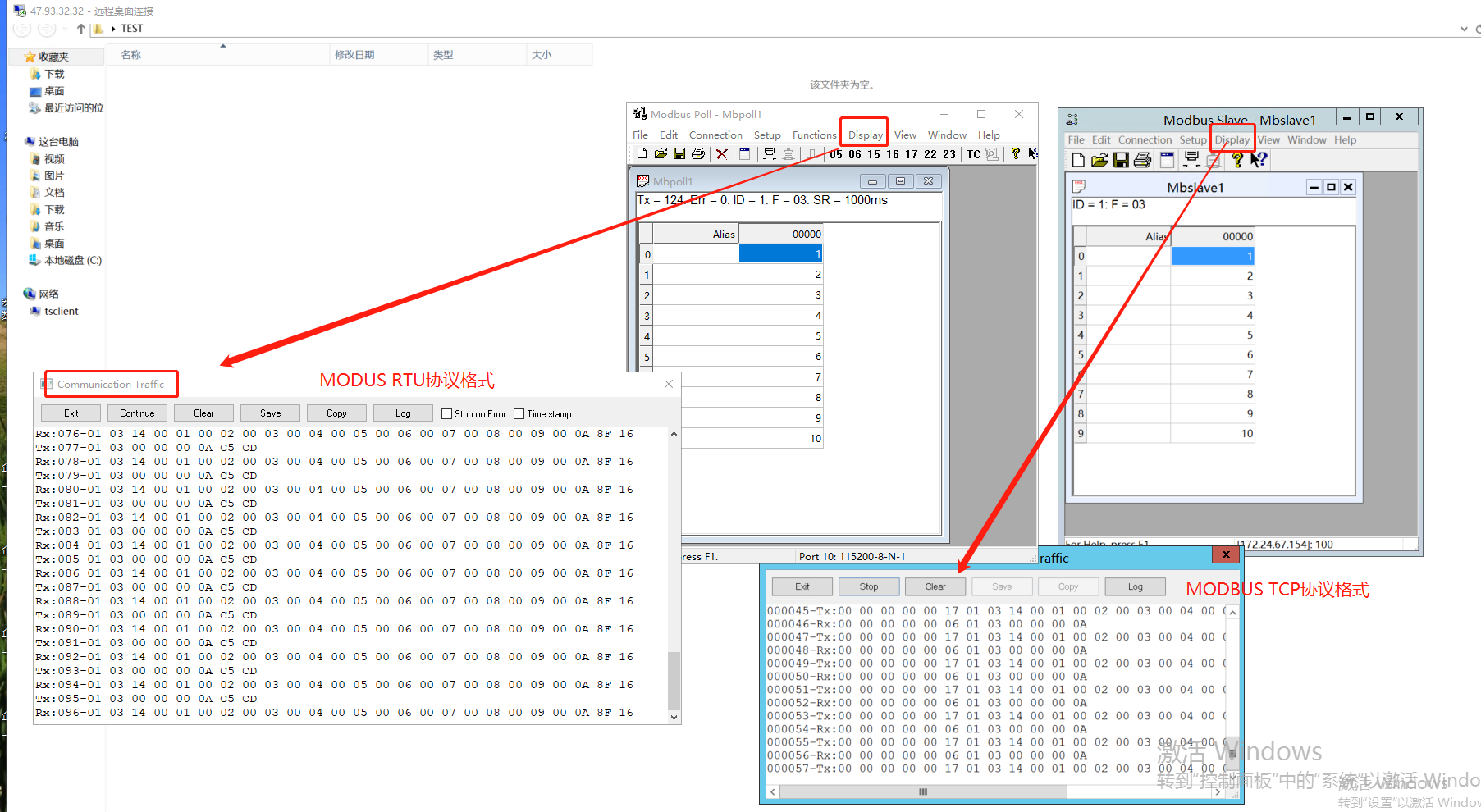 (2)數(shù)據(jù)監(jiān)控,MODBUS POLL和MODBUS SLAVE,都點(diǎn)擊Display,找到Communication Traffic,點(diǎn)開(kāi)就可以看到后臺(tái)數(shù)據(jù)。