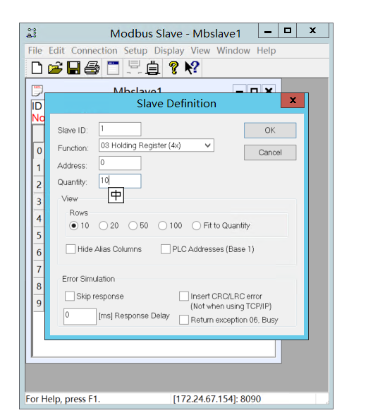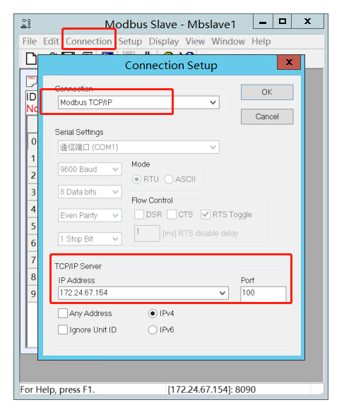 2、Modbus Slave軟件,點(diǎn)擊Connection,選擇Modbus TCP/IP,TCP/IP Server IP Address填遠(yuǎn)程服務(wù)器對(duì)應(yīng)的服務(wù)器地址IP,Port端口100。最后點(diǎn)擊OK。