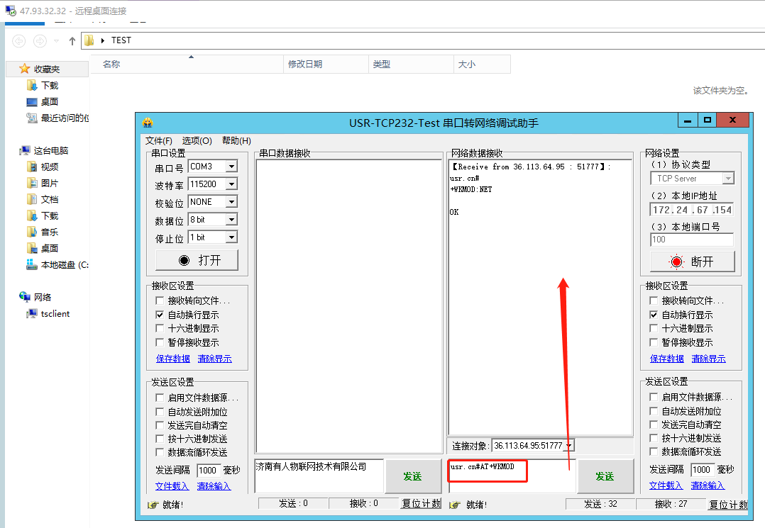以查詢工作模式為例,發(fā)送usr.cn#AT+WKMOD,后面帶回車換行,網(wǎng)絡(luò)助手接收到查詢到的AT指令參數(shù)。