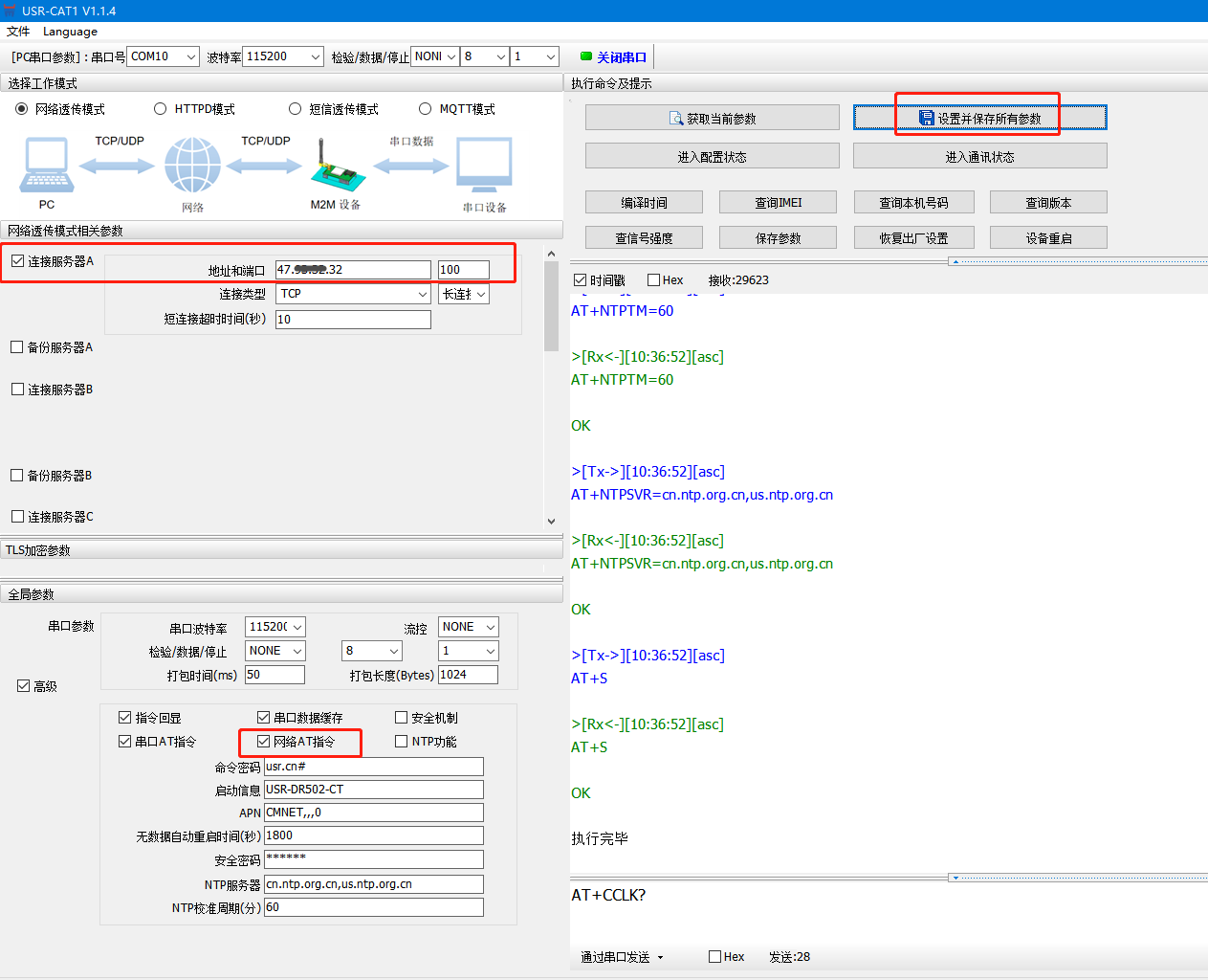 4、選擇網(wǎng)絡(luò)透傳模式,勾選連接服務(wù)器A,地址填遠程服務(wù)器地址,端口用100,勾選高級,勾選網(wǎng)絡(luò)AT指令(默認開啟),點擊設(shè)置并保存所有參數(shù),然后再關(guān)閉串口。