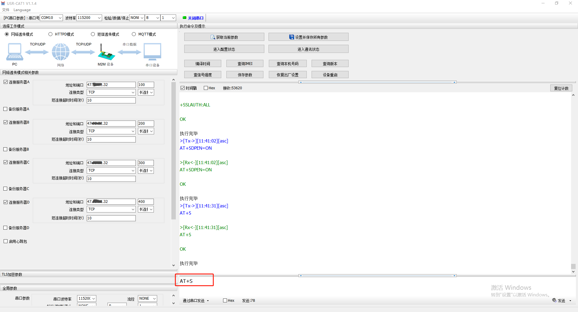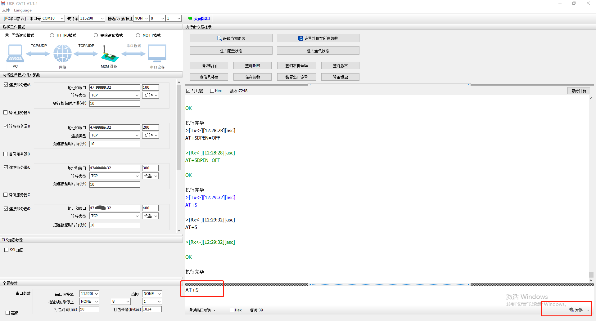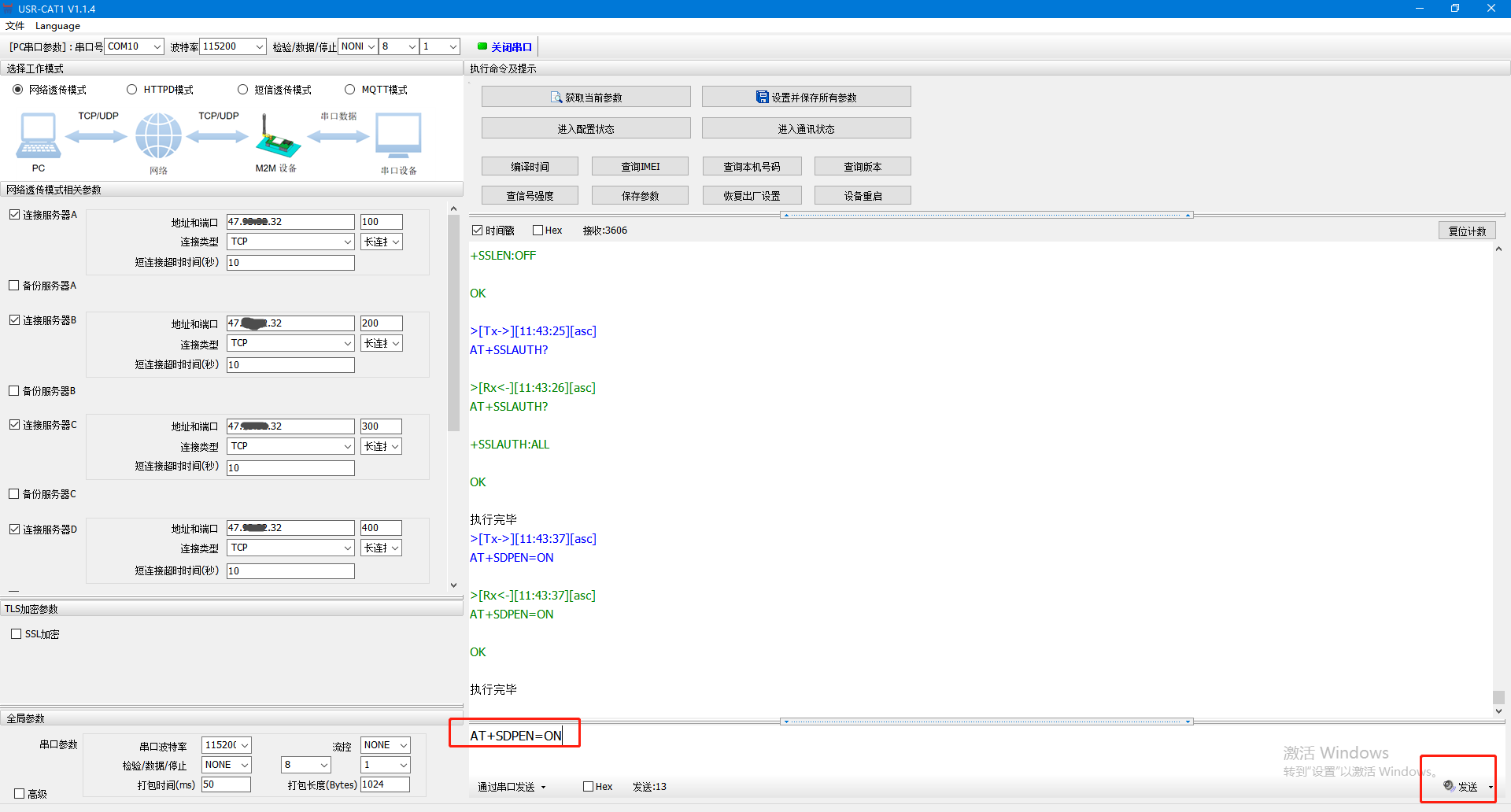 5、串口再次進(jìn)入配置狀態(tài),用AT指令A(yù)T+SDPEN=ON開啟套接字分發(fā)功能,再AT+S保存配置并重啟。