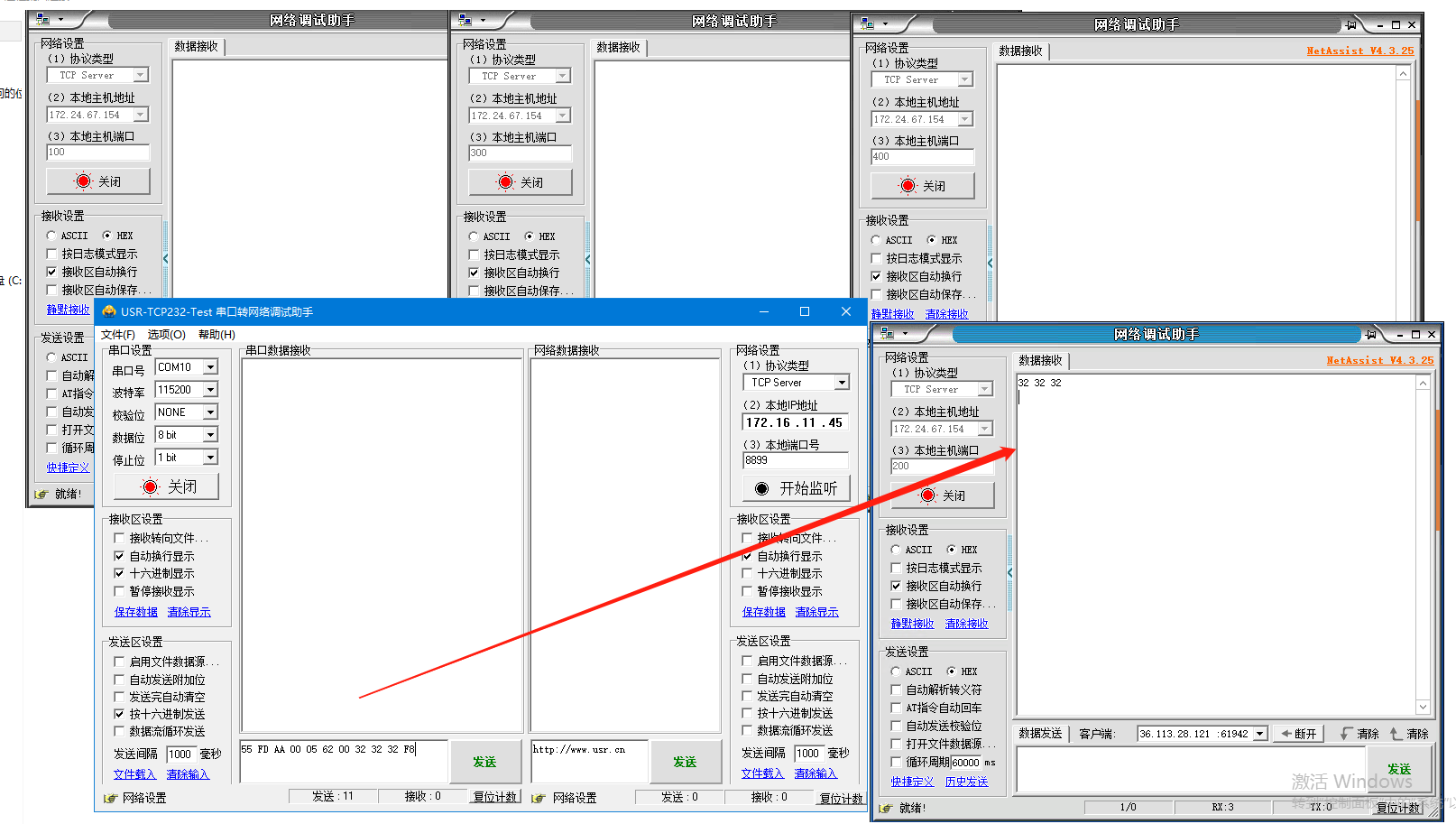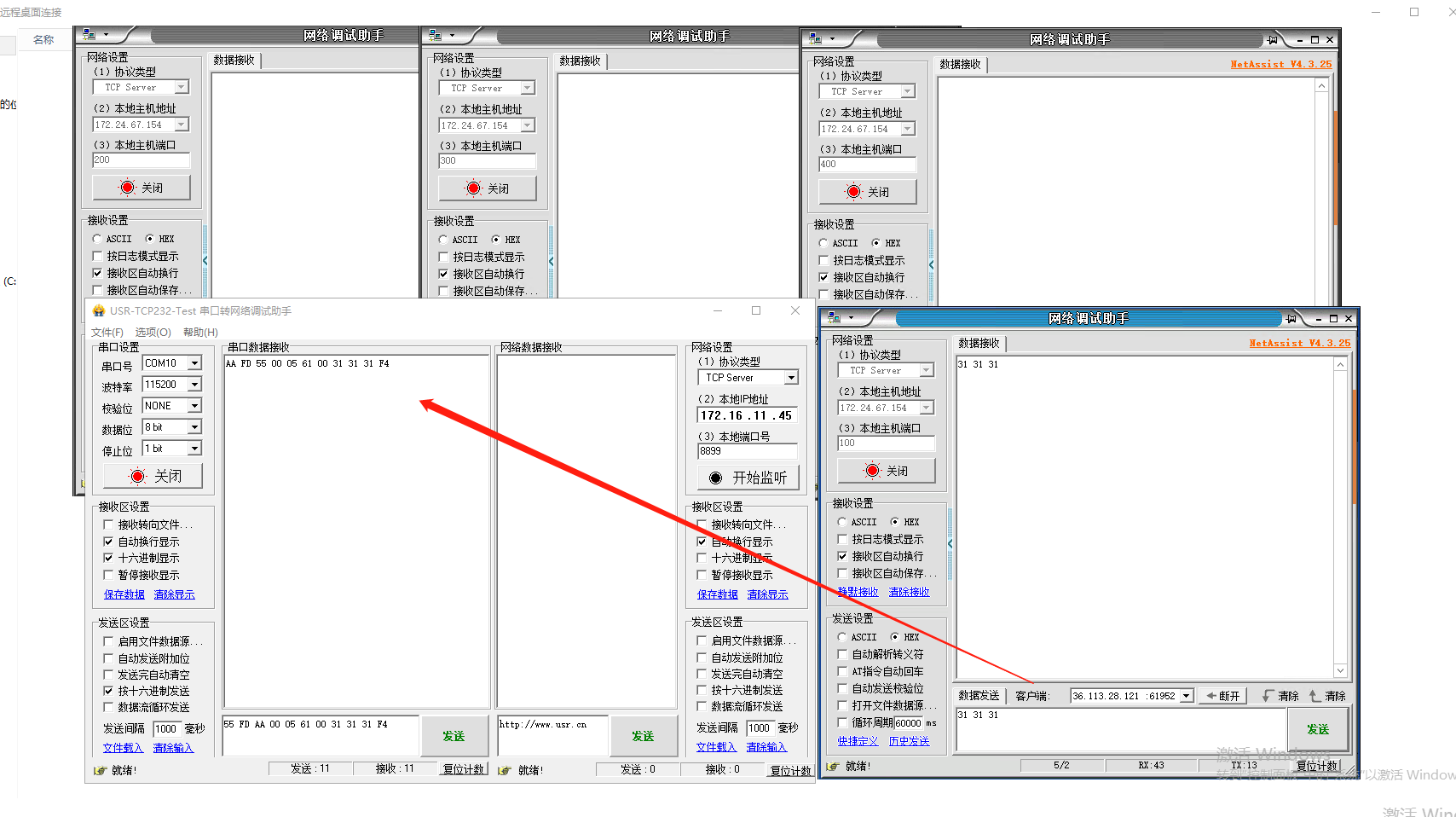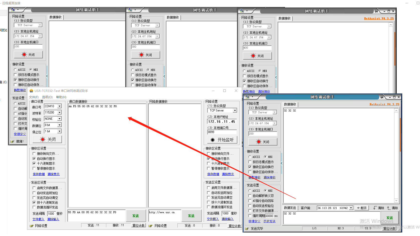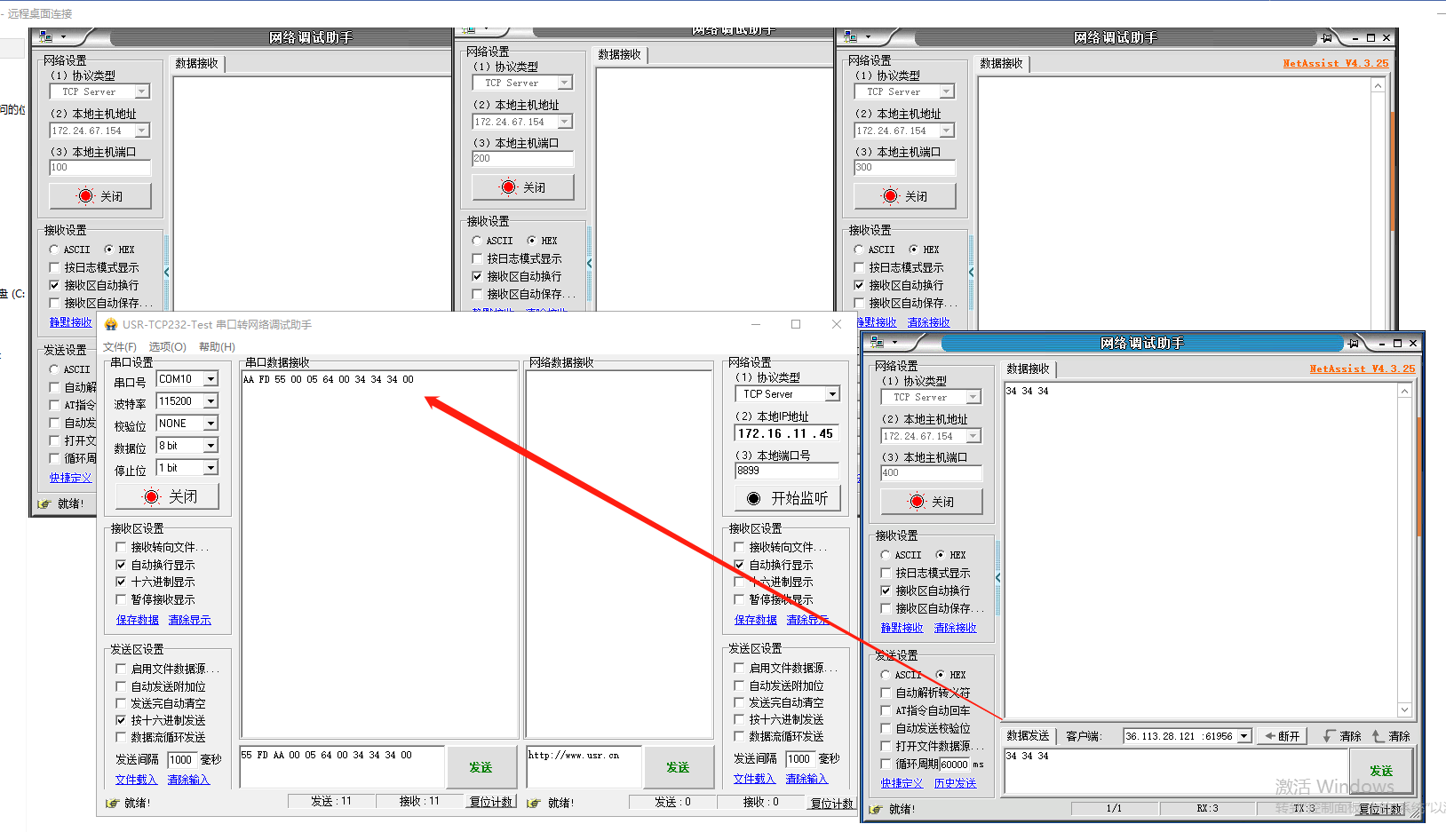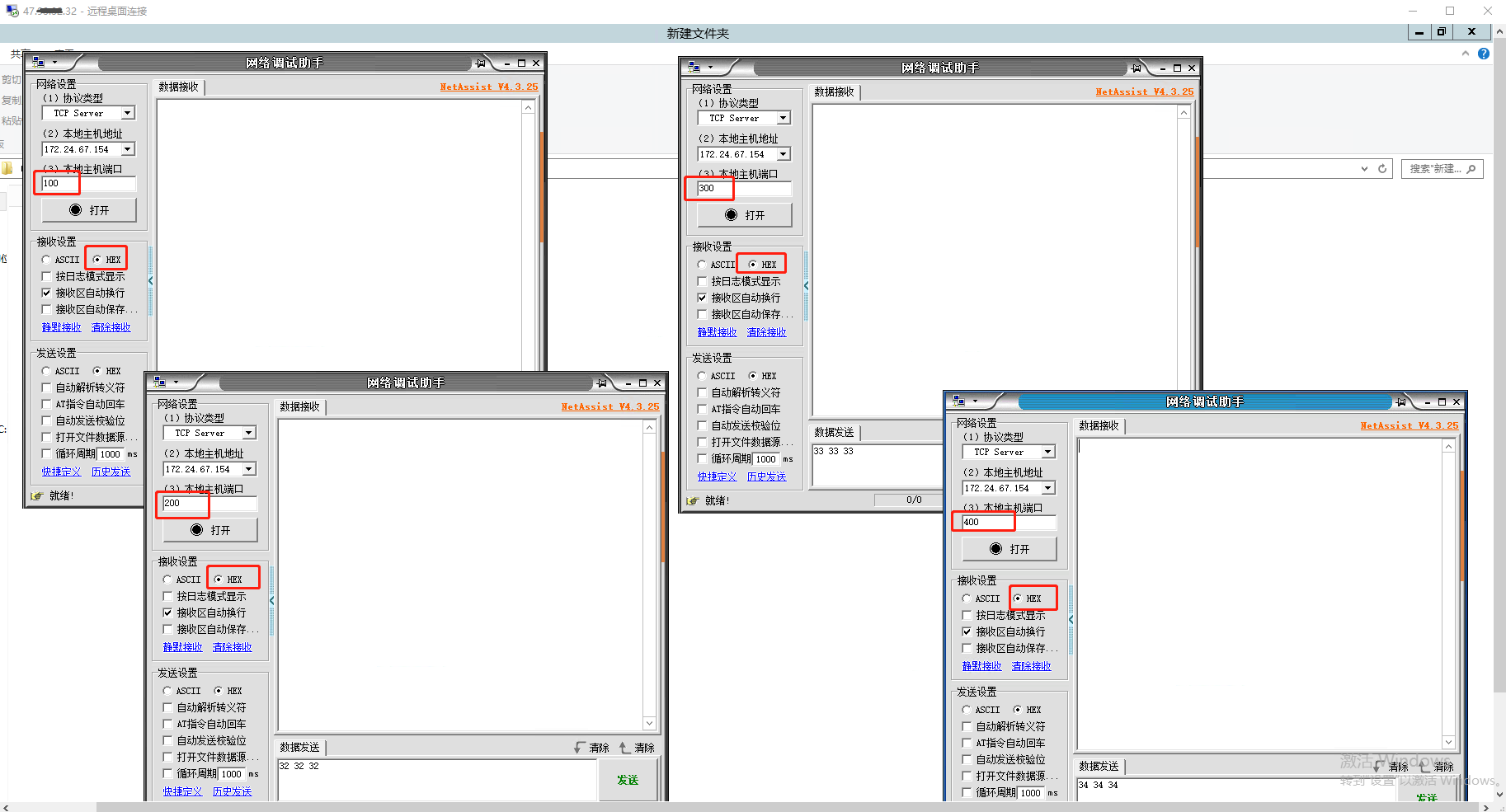 1、登錄遠(yuǎn)程服務(wù)器,打開4個網(wǎng)絡(luò)助手,分別使用4個端口100、200、300、400,點擊連接。USR-DR502會和4個網(wǎng)絡(luò)助手建立TCP連接。