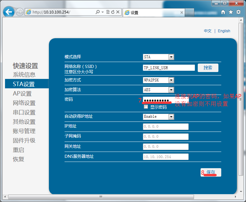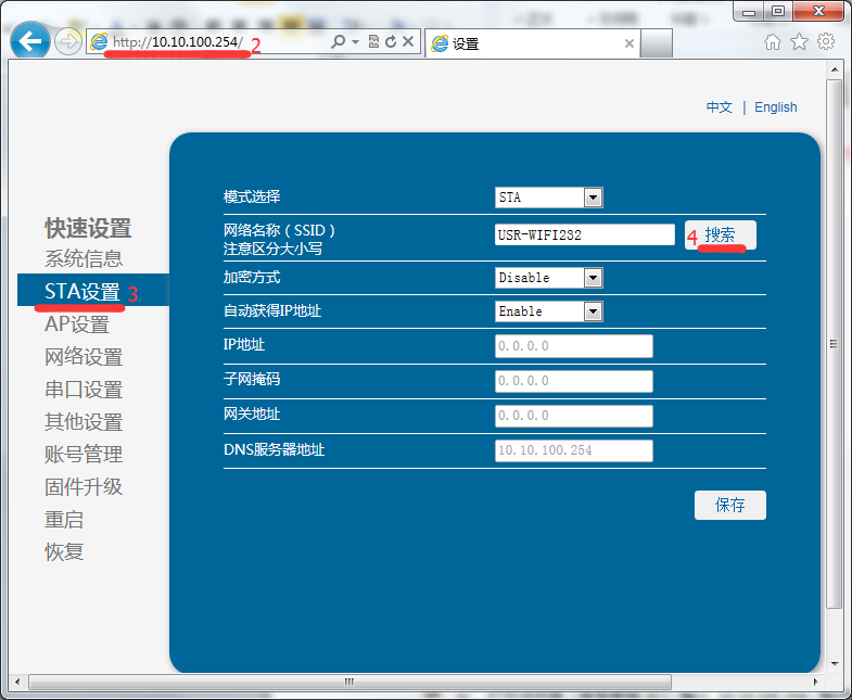 b)打開瀏覽器(推薦使用IE),輸入10.10.100.254,賬戶密碼為admin。進(jìn)入模塊網(wǎng)頁(yè)之后,參數(shù)做如下設(shè)置。