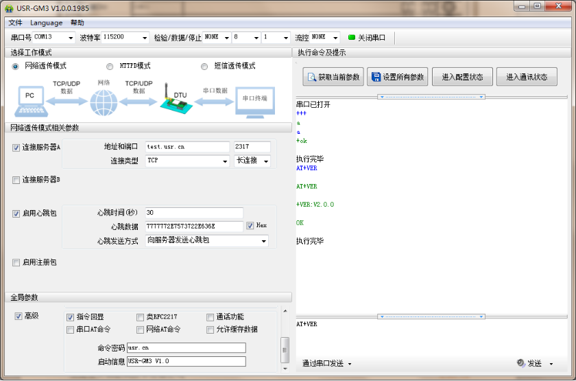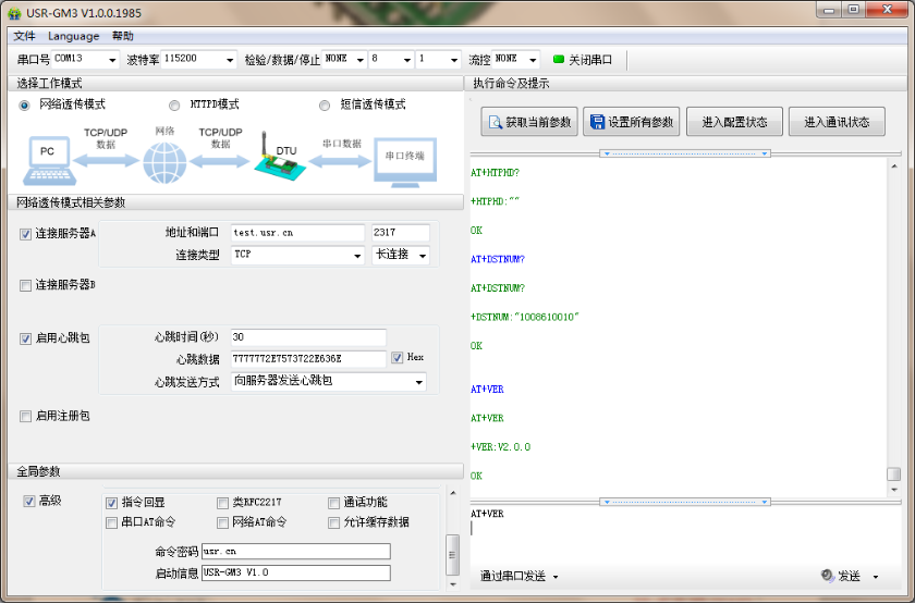 1、連接通訊串口,打開設置軟件,點擊進入設置狀態(tài),點擊獲取當前參數查看連接是否正常,發(fā)送指令AT+VER 回車查看固件版本信息
