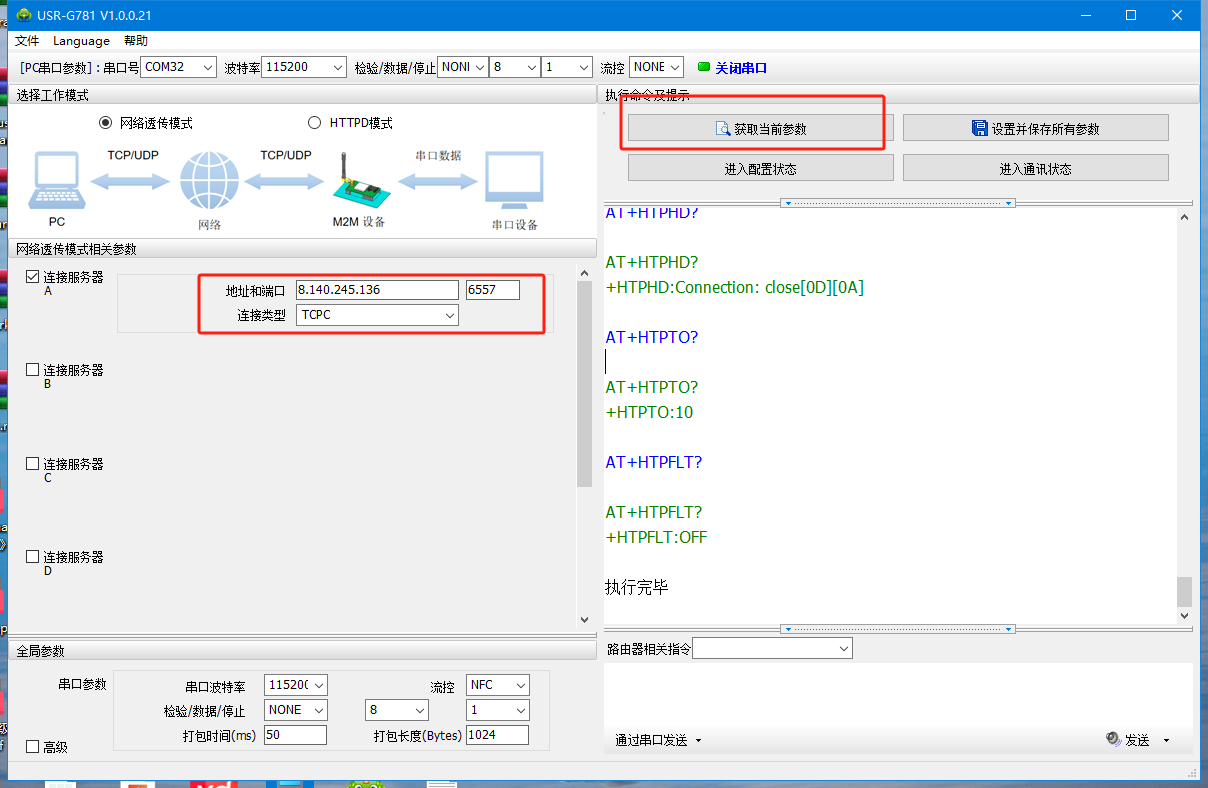 3、獲取當(dāng)前參數(shù)----設(shè)置工作模式為“網(wǎng)絡(luò)透傳模式”,輸入遠(yuǎn)程服務(wù)器的IP和端口。