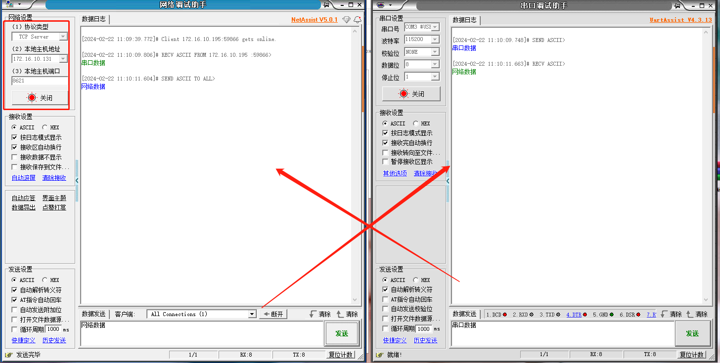 電腦上開一個網(wǎng)絡調(diào)試助手為server,本地IP:172.16.10.131本地端口為:8621