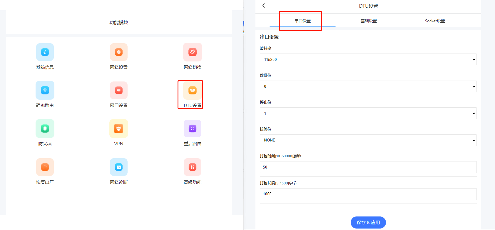 2、DTU配置界面--串口設(shè)置--配置G815的串口參數(shù)和串口要連接的真實(shí)終端設(shè)備的串口參數(shù)保持一致。本案例以默認(rèn)為主。