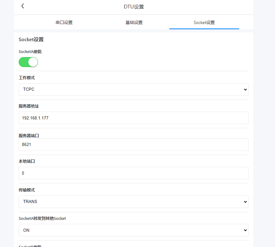 3、socket設(shè)置--配置G815為T(mén)CPC,連接遠(yuǎn)程服務(wù)器地址和端口。保存重啟生效。