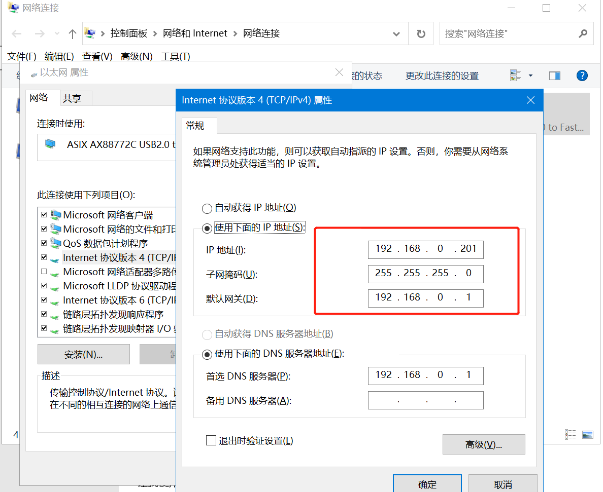 USR-TCP232-T1 網(wǎng)口用網(wǎng)線連接交換機,電腦網(wǎng)口接交換機,電腦IP和T1的IP設置同一網(wǎng)段。USR-TCP232-T1 默認IP是192.168.0.7。因此電腦設置靜態(tài)IP,192.168.0.201,子網(wǎng)掩碼 255.255.255.0,網(wǎng)關192.168.0.1。