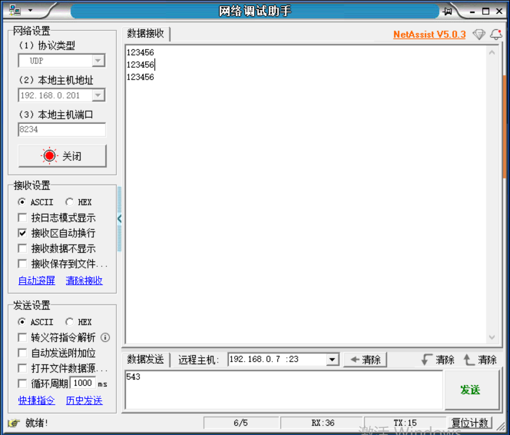 第二個電腦打開一個網(wǎng)絡調試助手 IP和T1保持同網(wǎng)段,端口是8234,也可以接收到T1串口發(fā)送的消息。