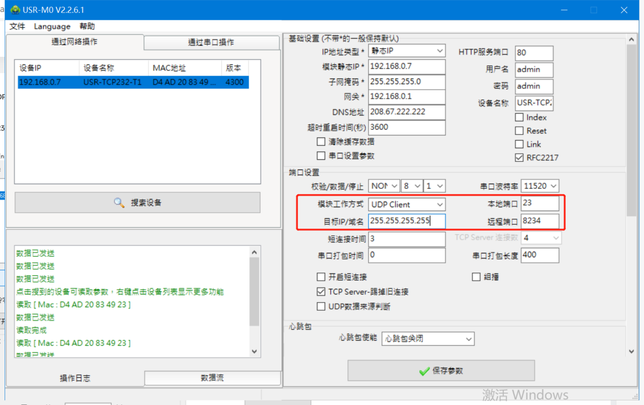 USR-TCP232-T1工作方式UDP Client 目標IP 255.255.255.255 遠程端口8234 本地端口23