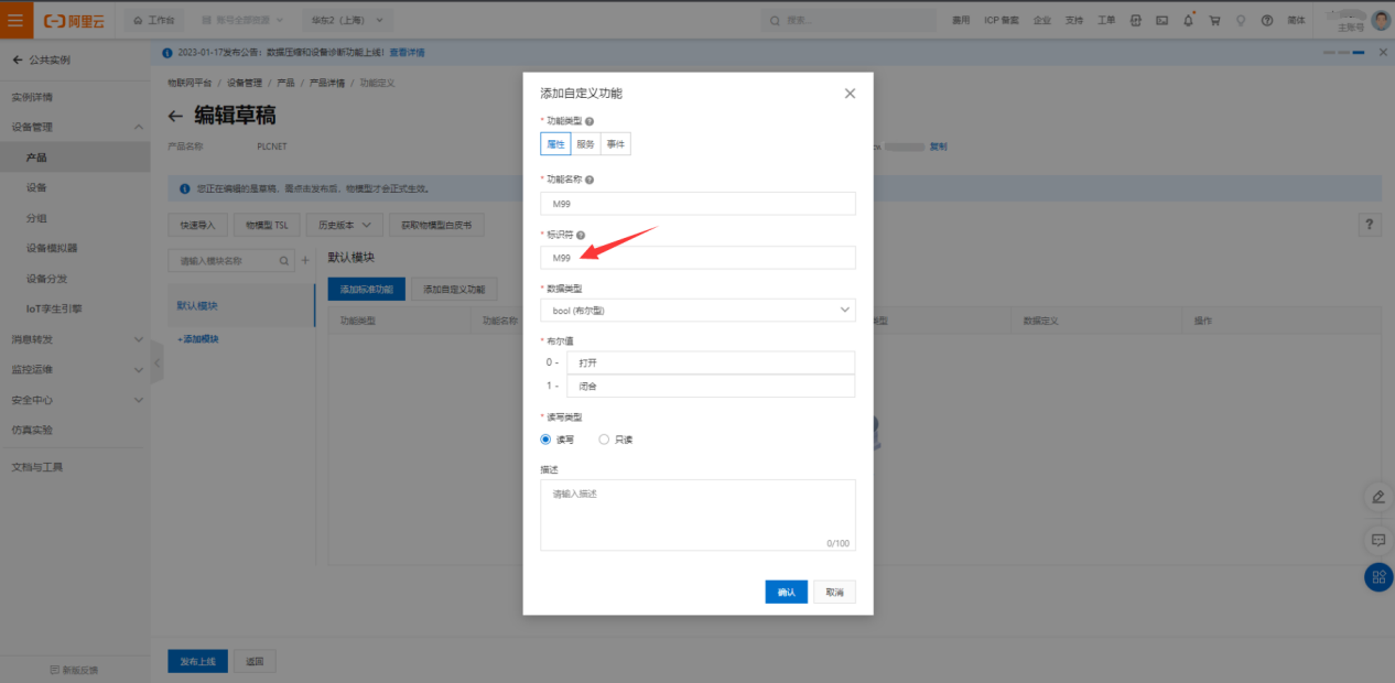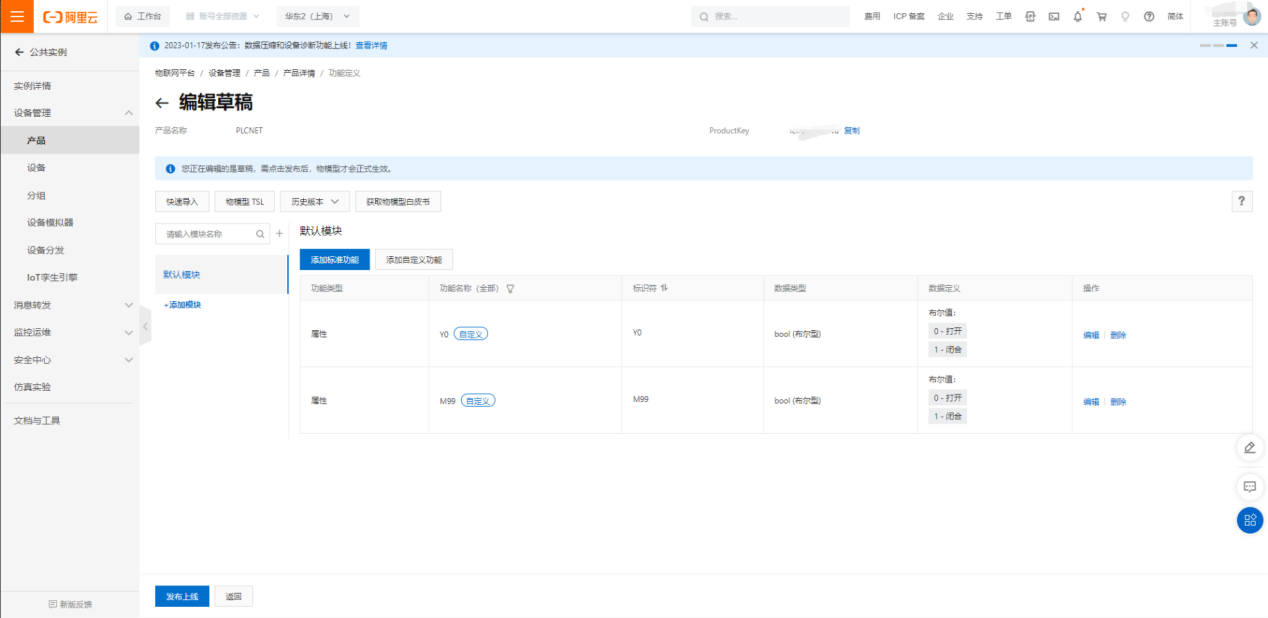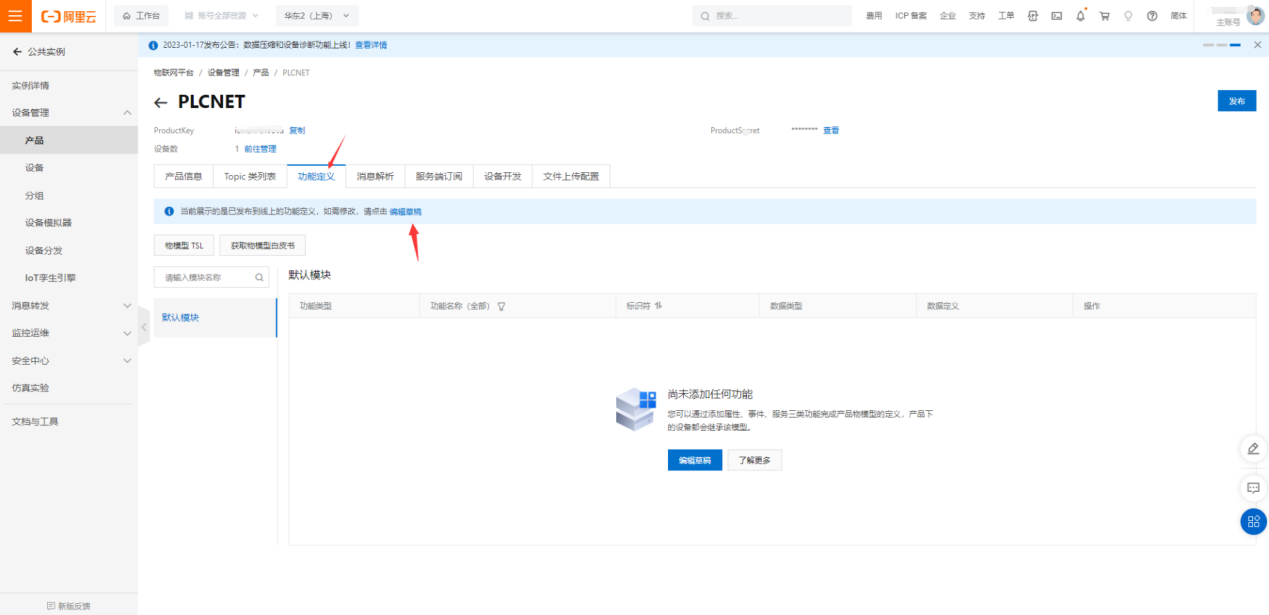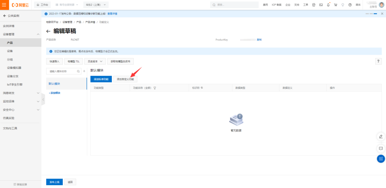 11、打開阿里云產(chǎn)品,點(diǎn)進(jìn)剛才添加的產(chǎn)品內(nèi),功能定義-編輯草稿-添加自定義功能