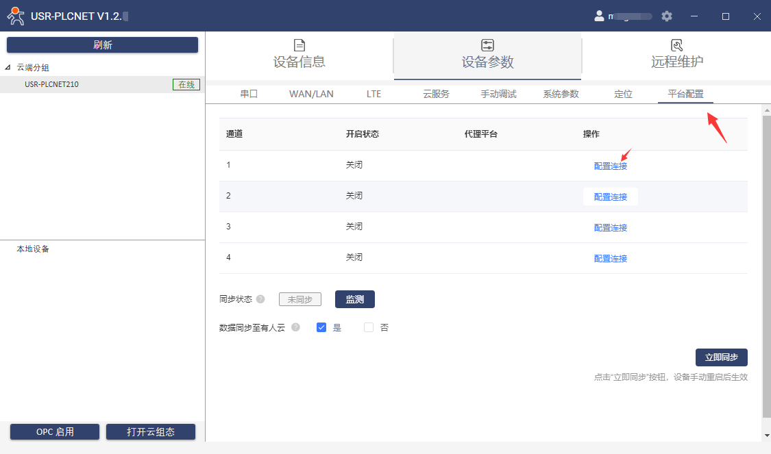 7、設(shè)備配置連接阿里云,點(diǎn)擊 設(shè)備參數(shù)-平臺配置-配置連接 (此功能需在有人云在線后配置)