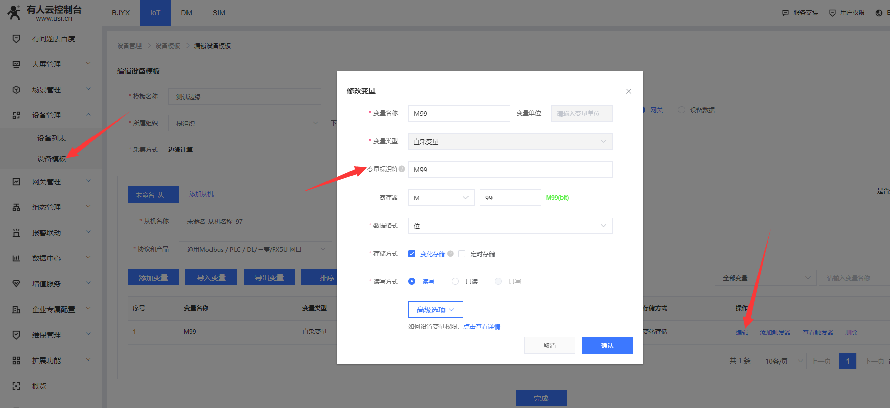 10、打開有人云平臺 設(shè)備管理-設(shè)備模板-編輯,每個(gè)數(shù)據(jù)點(diǎn)有對應(yīng)變量標(biāo)識符,可自定義