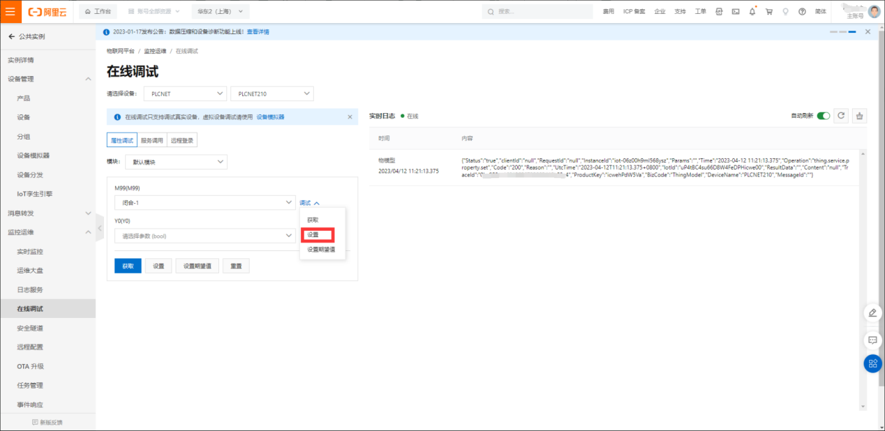 14、平臺下發(fā)數(shù)據(jù)在 監(jiān)控運(yùn)維-在線調(diào)試,選擇數(shù)據(jù)點(diǎn)設(shè)置對應(yīng)值后設(shè)置,數(shù)據(jù)下發(fā)